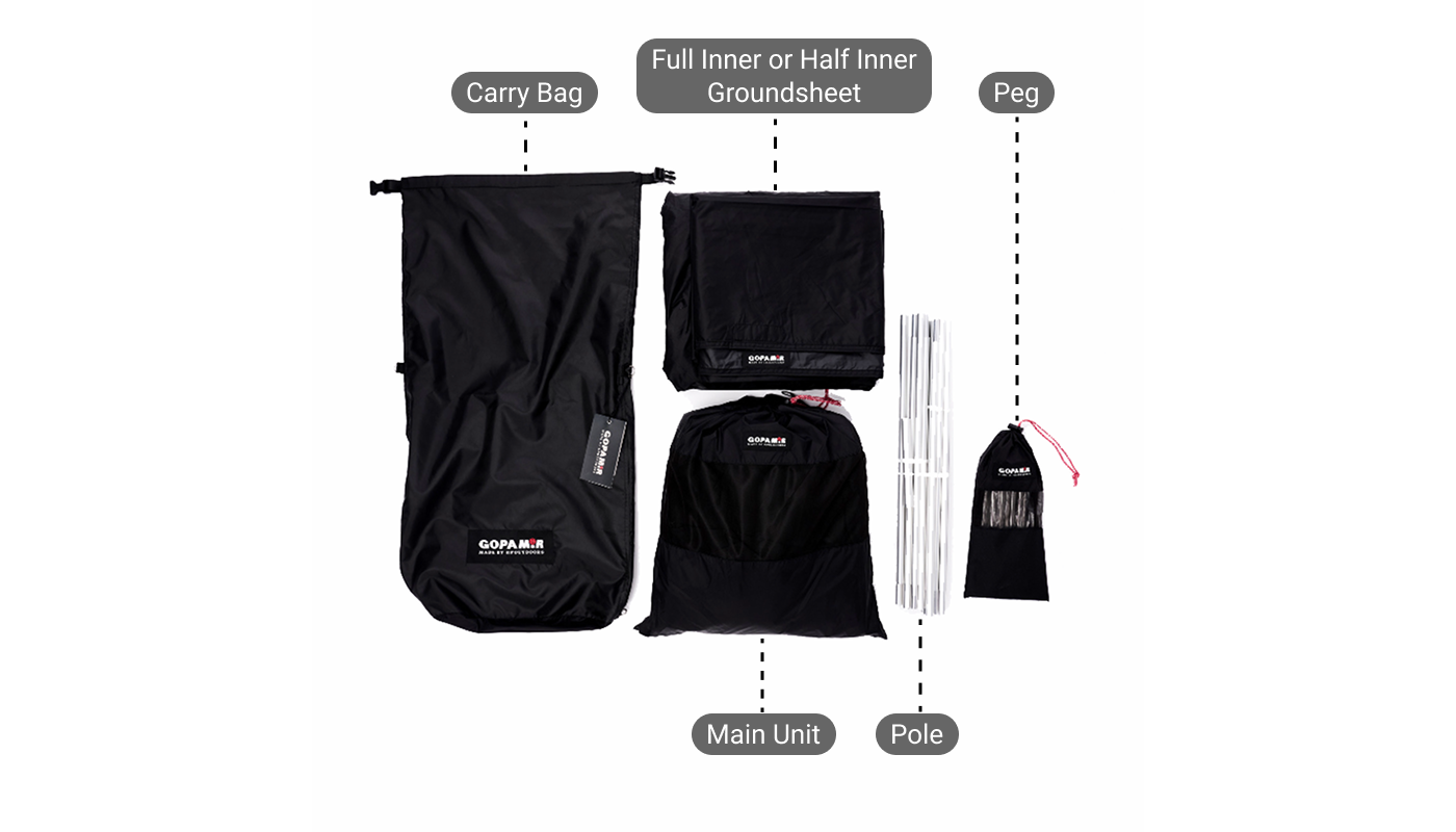 Package Includes: Tent & Fly * 1, Mesh Door * 2, Carry Bag & Accessory Pouch * 1, Optional Inner Tent (choose one: Full Inner or Half Inner) * 1, Groundsheet * 1, DAC Aluminum Pole(12mm) * 2, Aluminum Peg * 10