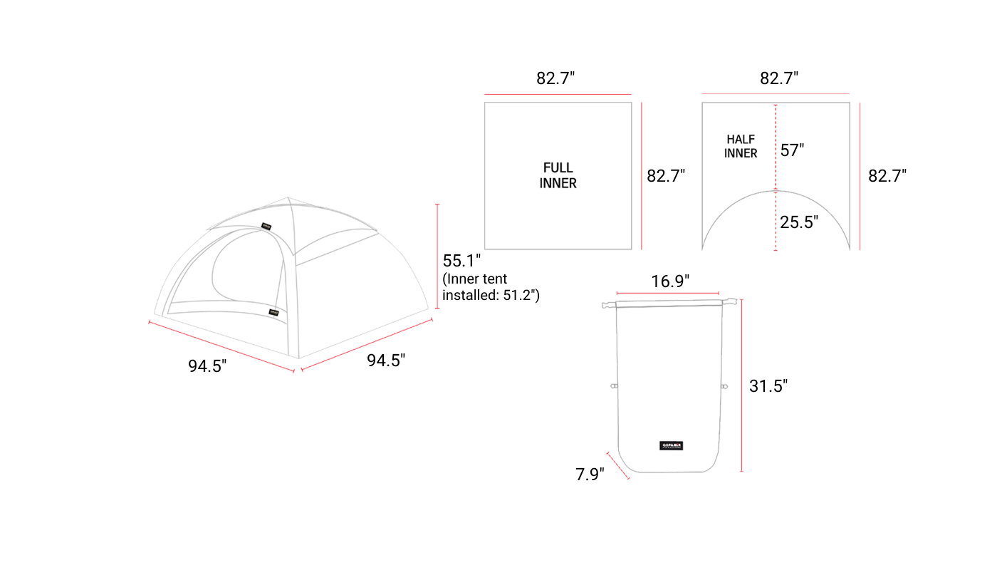 • Main Tent: 94.5"(W) x 94.5"(D) x 55.1"(H)