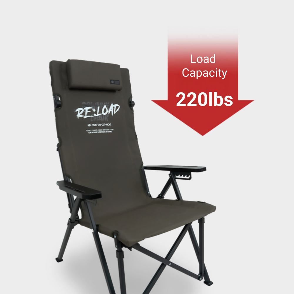 The Down Hill Chair Reload Plus is a premium camping chair with adjustable 6-step recline, solid wooden armrests, a lightweight aluminum frame, water-repellent polyester fabric, and a detachable neck cushion for ultimate comfort.