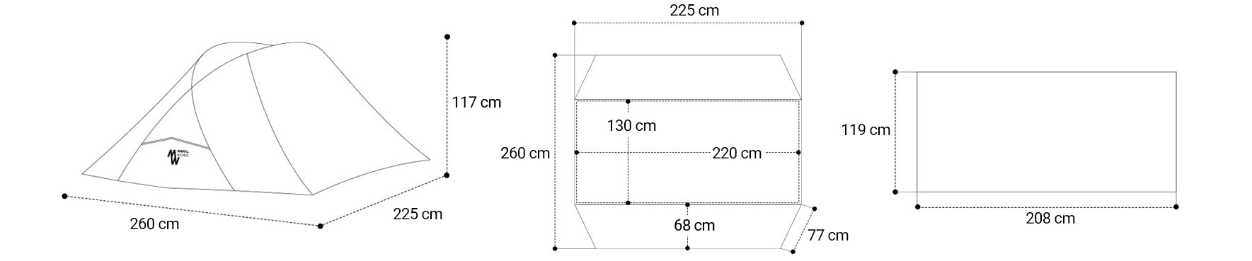 • Inner Tent: 86.6"(W) × 51.2"(D) × 43.3"(H) (220 × 130 × 110 cm)