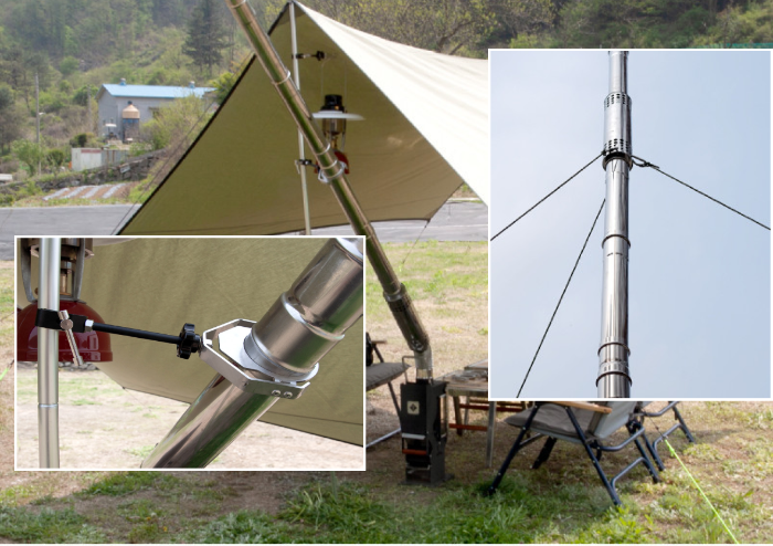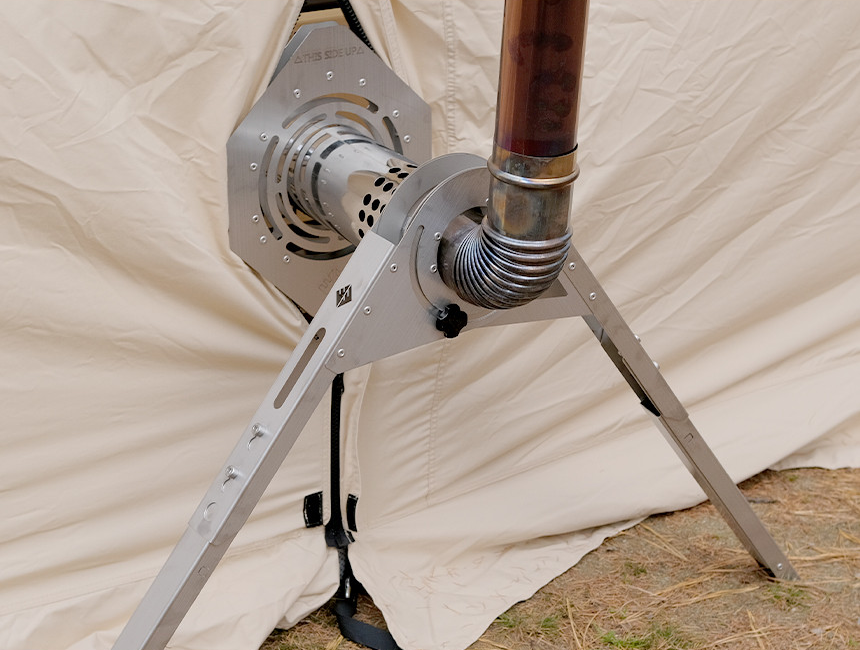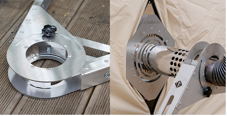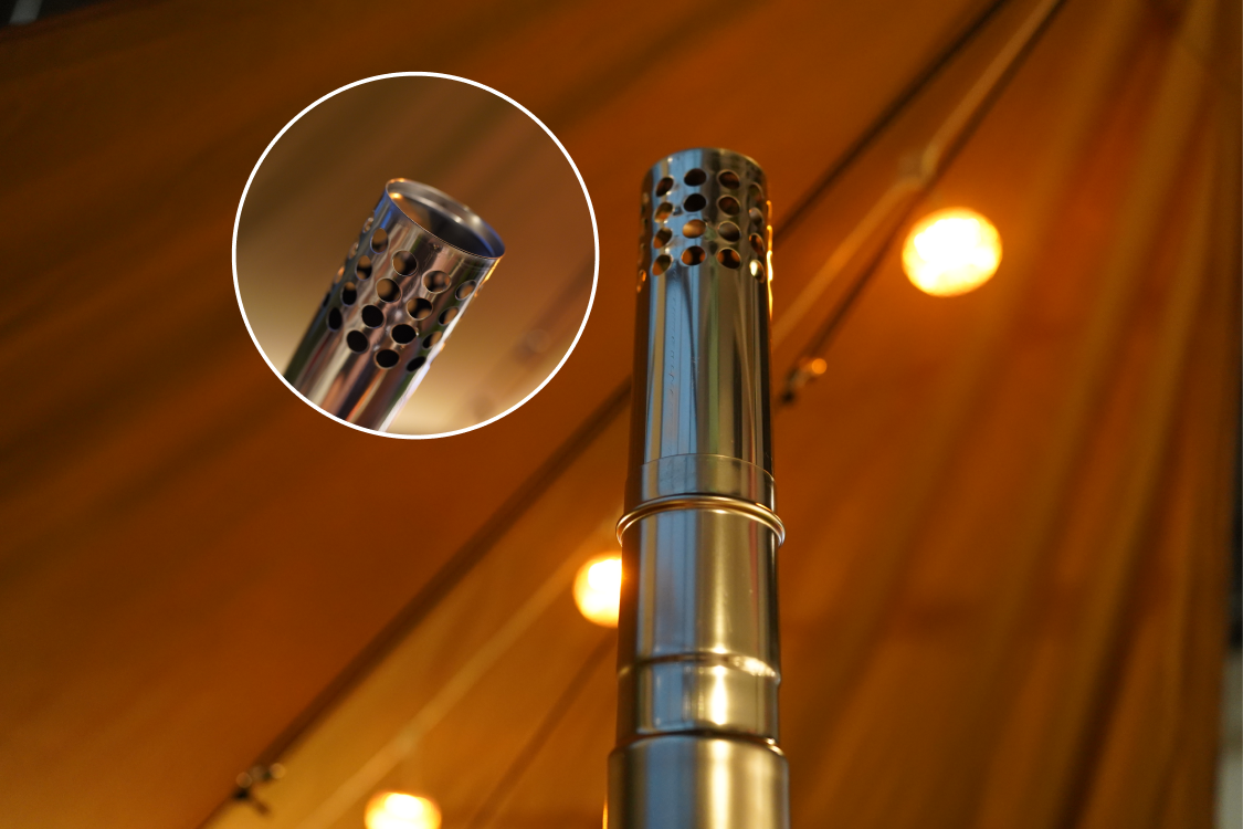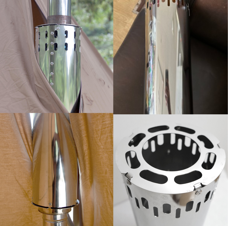 - Rallonge de tuyau de cheminée latérale : spécialement conçue pour soutenir le tuyau de cheminée lors de son extension à travers la paroi latérale de votre tente, offrant stabilité et sécurité.