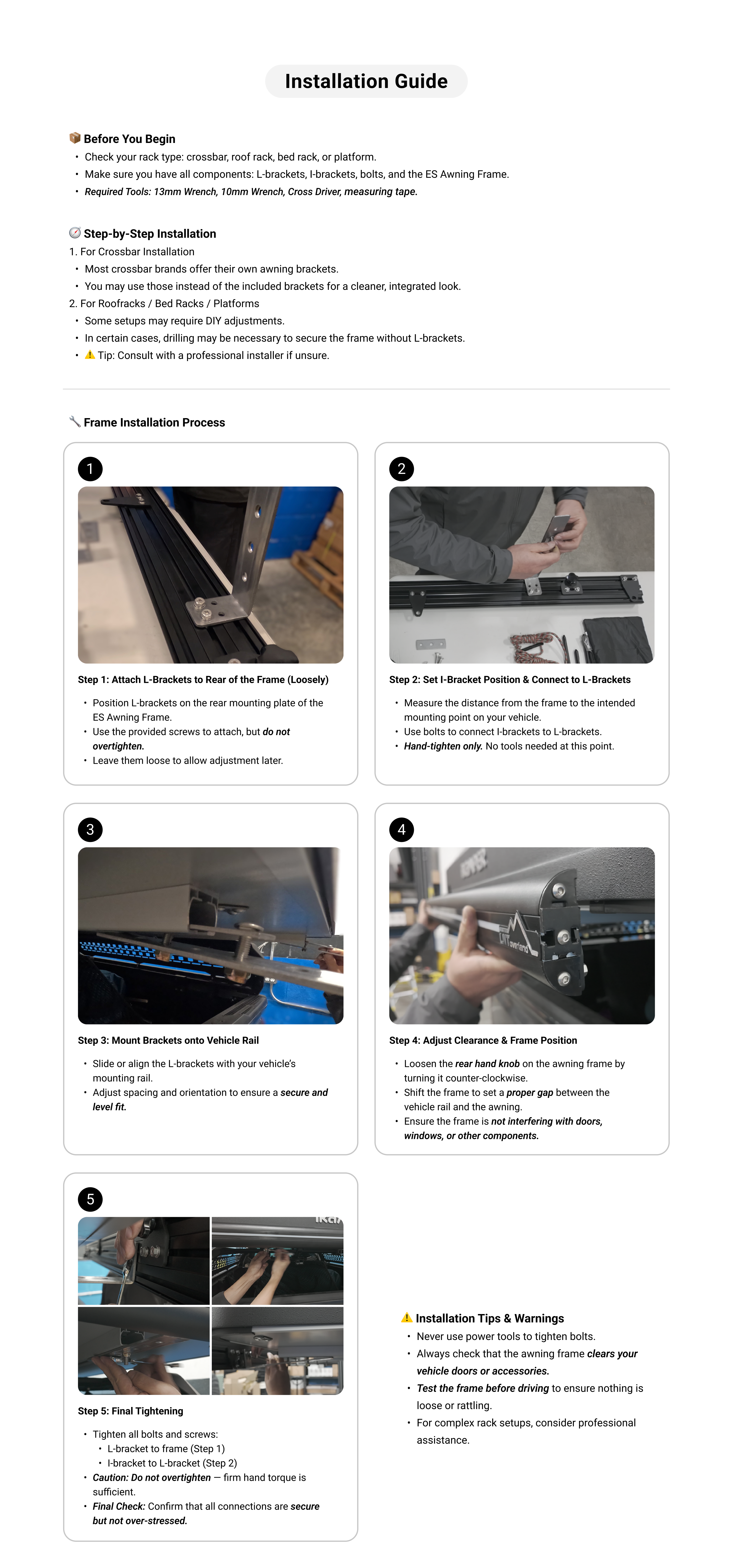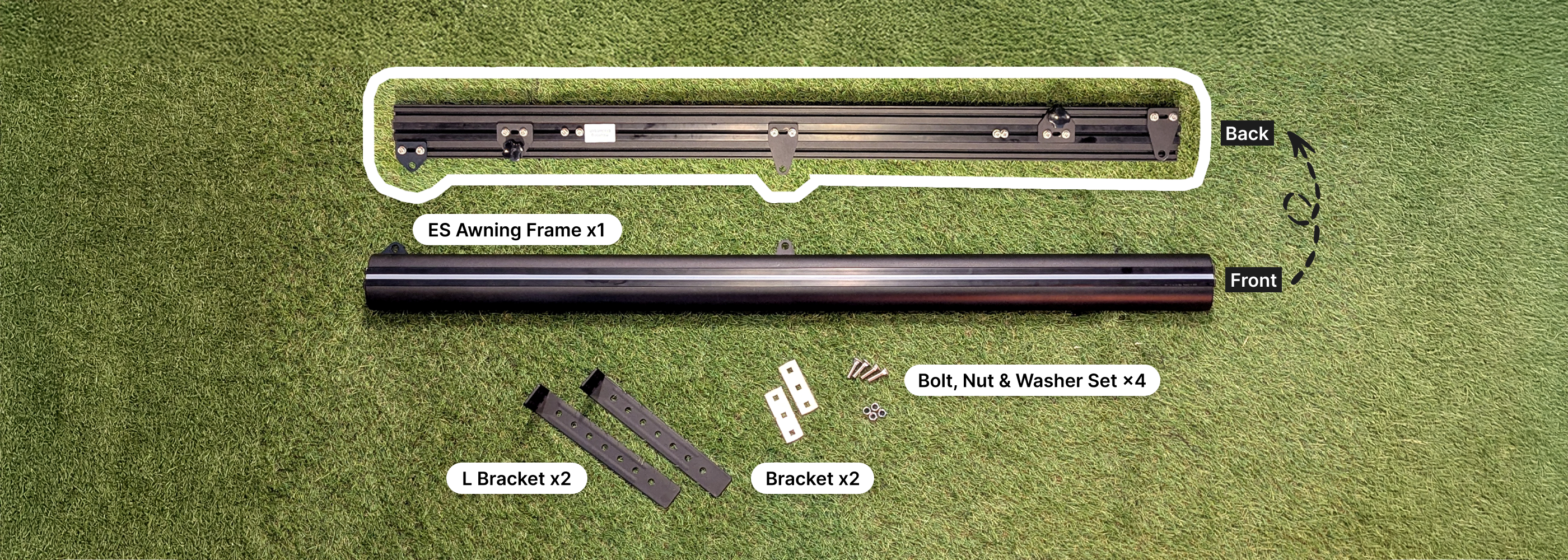 The ES Awning Frame comes in two size options — 2000 and 1300. Typically, the 2000 frame is installed on the side of the vehicle, while the 1300 is mounted at the rear. With both frames installed, you can mount the ES 2000 and ES 1300 Awning Tarps together for full coverage, or mount the LNT 280 Awning for a wider 280-degree shelter.