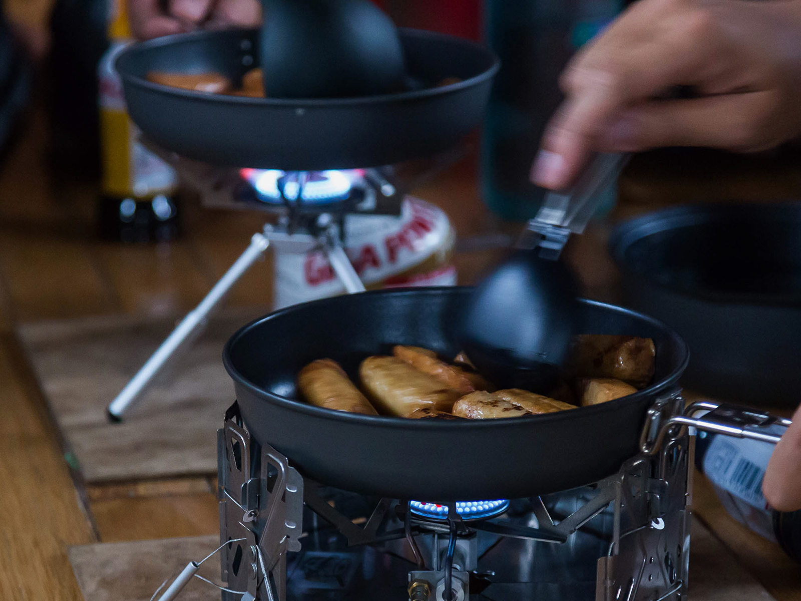 This collapsible ladle is designed with a nylon head to prevent scratching non-stick surfaces and features a fold-away handle for compact storage. It is developed for outdoor cooking environments and manufactured in Japan to ensure reliable build quality.