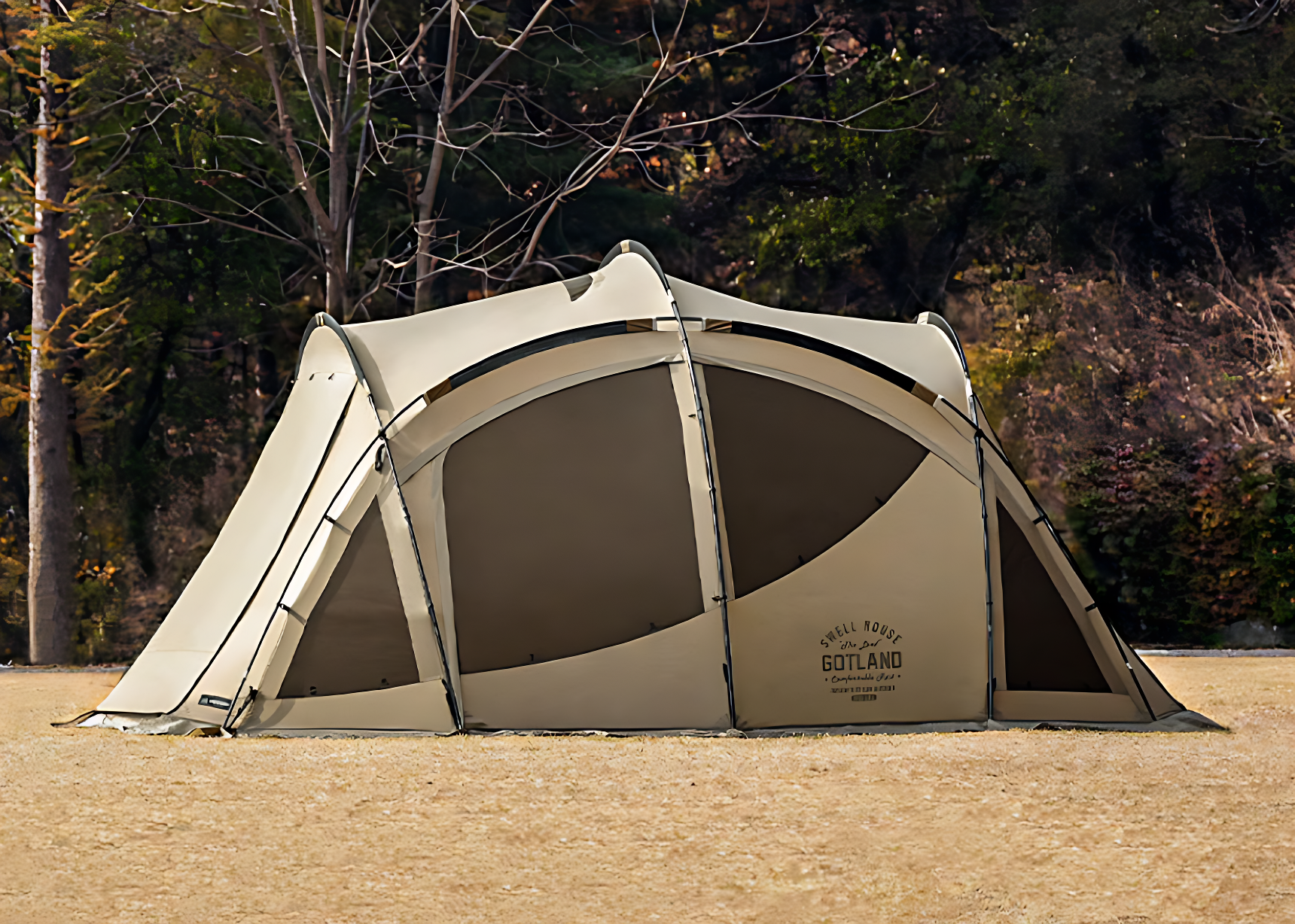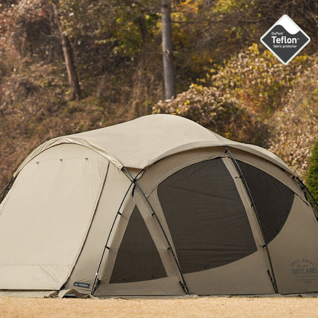 Designed in harmony with nature, the Gotland Swell House Tent provides a spacious living area with wide entryways and windows for an open view. Its high ceilings and rounded structure allow for comfortable movement and relaxation. Featuring Teflon-coated ripstop fabric, this tent ensures superior water repellency, UV protection, and resistance against contamination, making it an excellent choice for all-season camping.