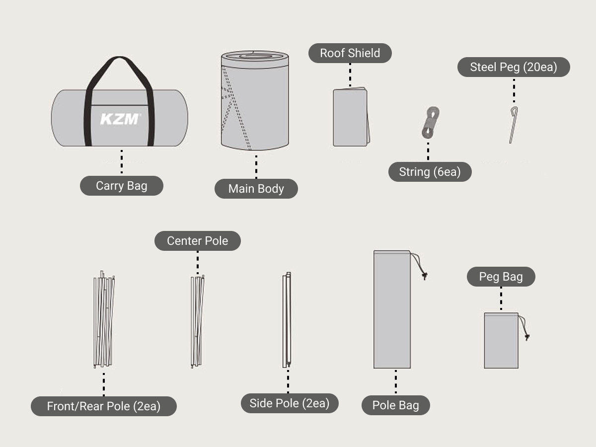 Front/Rear Pole * 2, Center Pole * 1, Side Pole * 2, Pole Bag * 1, Peg Bag * 1