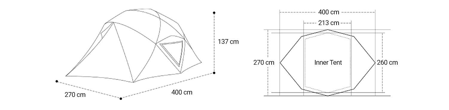 • Inner Tent: 83.9"(W) × 102.4"(D) × 51.2"(H) (213 × 260 × 130cm)