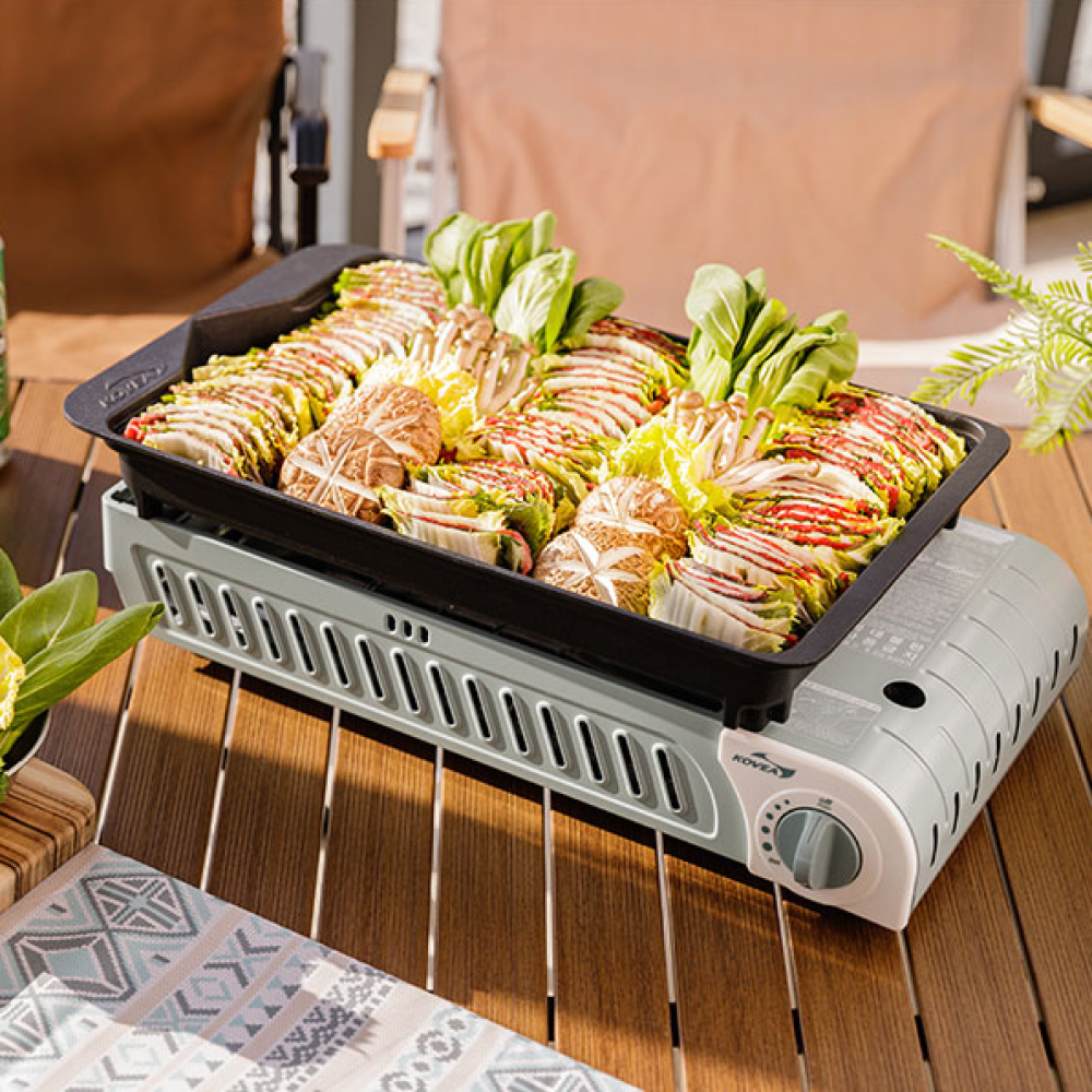 The U-shaped burner with internal drip pan ensures even heating and less smoke, while the non-stick 3-way pan, stainless steel radiator plate, and ceramic-coated lid allow safe and easy cooking of various dishes. The dedicated carrying bag and magnetic governor make setup, transport, and storage effortless.