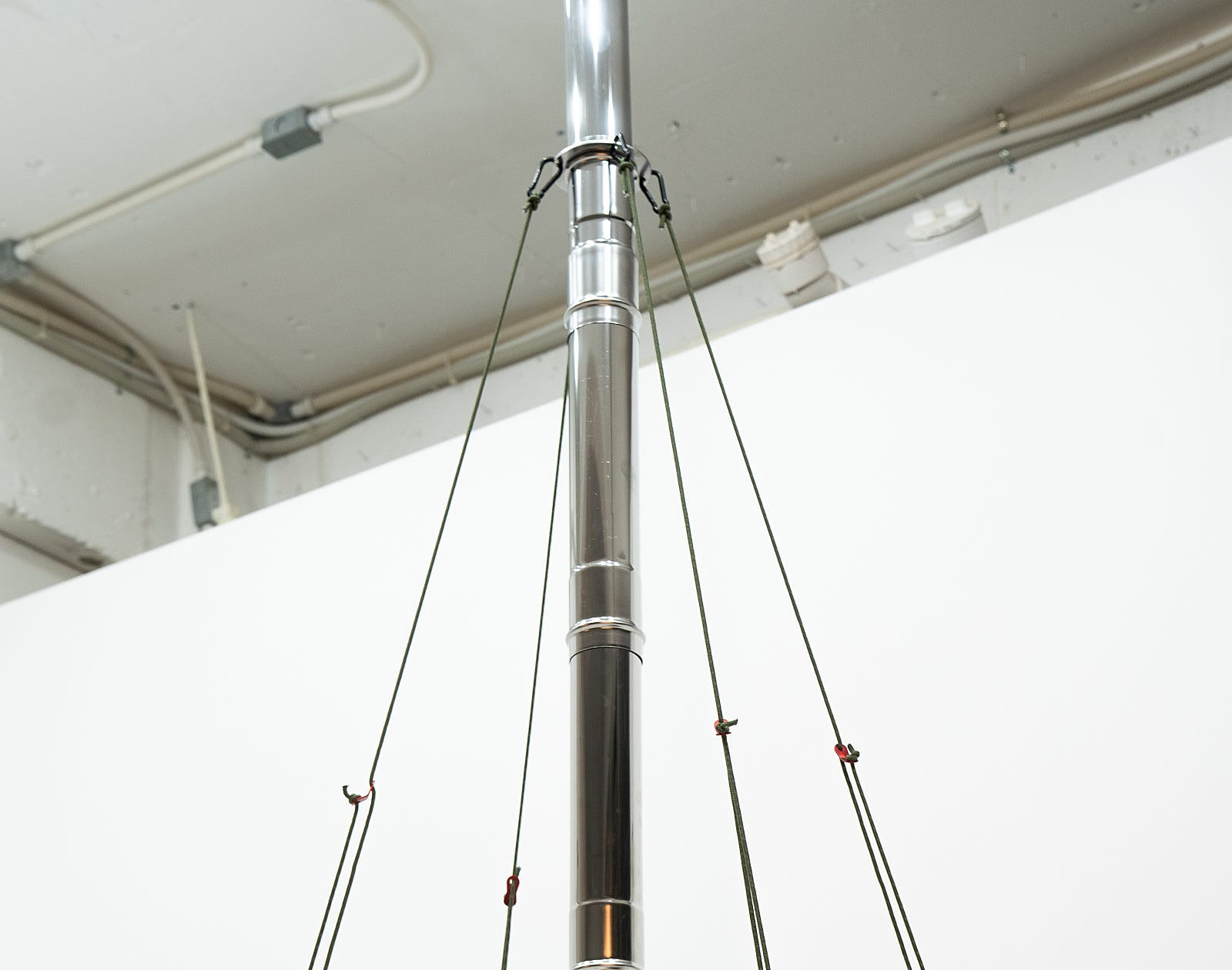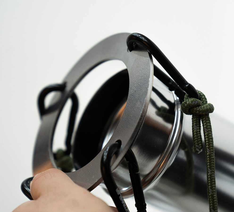 Attach the carabiner to the string that has been cut to 2.5 meters, and then hook the carabiner onto the string holder. Position the string holder at the middle section of the chimney setup, specifically at the reducer.