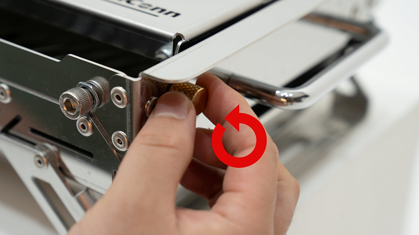 To remove the side flaps of the Unicorn M main body, begin by loosening the bolts. Grip the bolt securely and turn it counterclockwise until it is fully unscrewed. Repeat this process for all four sides to detach the side flaps.