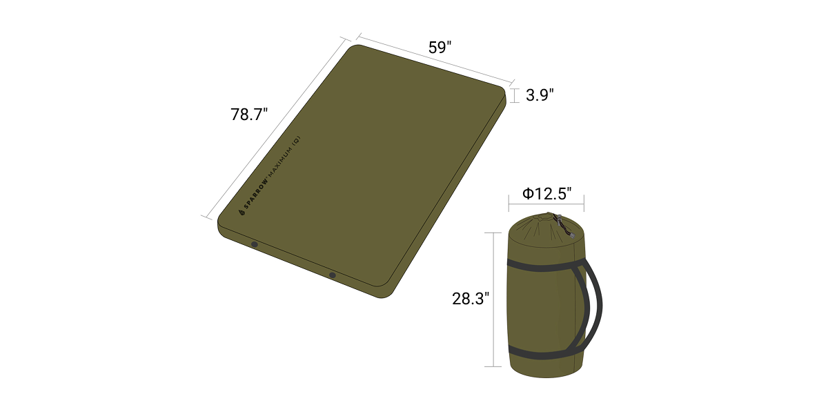 The Maximum - Queen is a 3.9"(10 cm) high, extra-wide outdoor mat with 50D stretch fabric, 3D sidewalls, TPU coating, non-slip base, and roll-up storage, providing comfortable and safe sleep for 2–3 people.