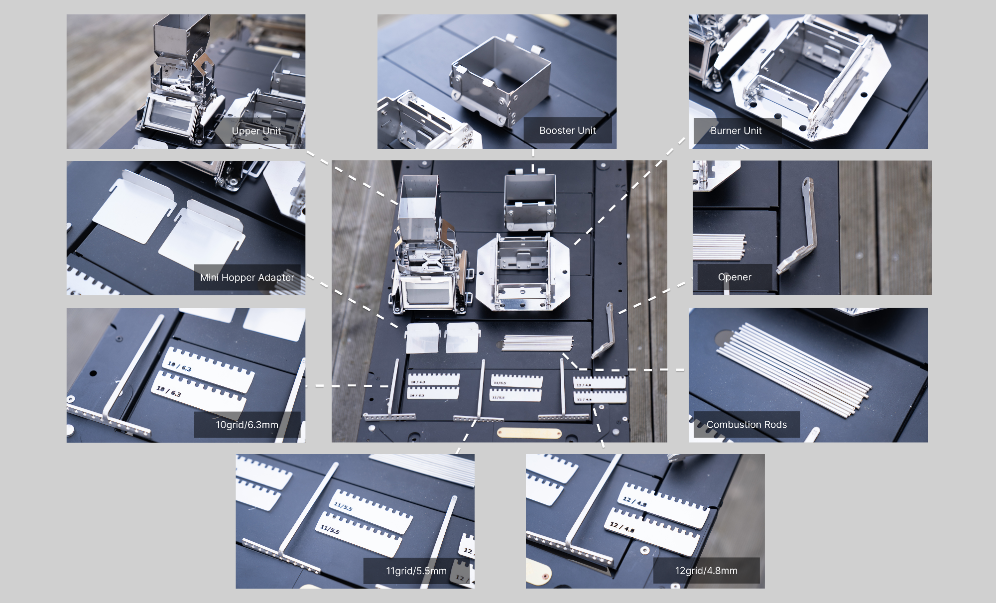 Uper Unit x1, Booster Unit x1, Bottom Unit x1, Mini Hopper Adapter x1, Opener x1, Combustion Rods x12, Grid Kits x3 (10grid/6.3mm, 11grid/5.5mm, 12grid/4.8mm)