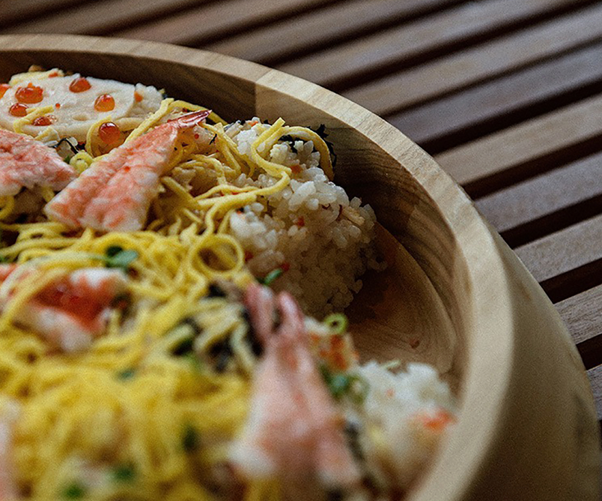 The Party Plate is a Japanese-designed laminated wood serving plate with removable inner stainless steel plates for versatile use. All components stack neatly for compact storage, making it suitable for parties or small gatherings.