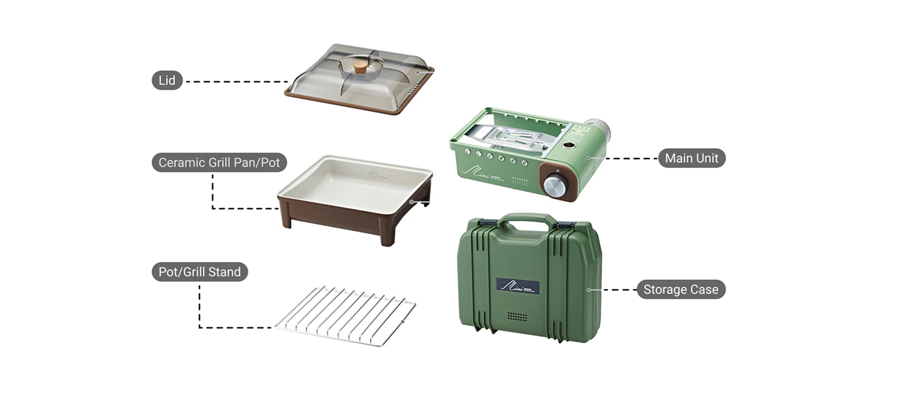 Package Includes: Main Unit * 1, Lid * 1, Ceramic Grill Pan/Pot * 1, Pot/Grill Stand * 1, Storage Case * 1