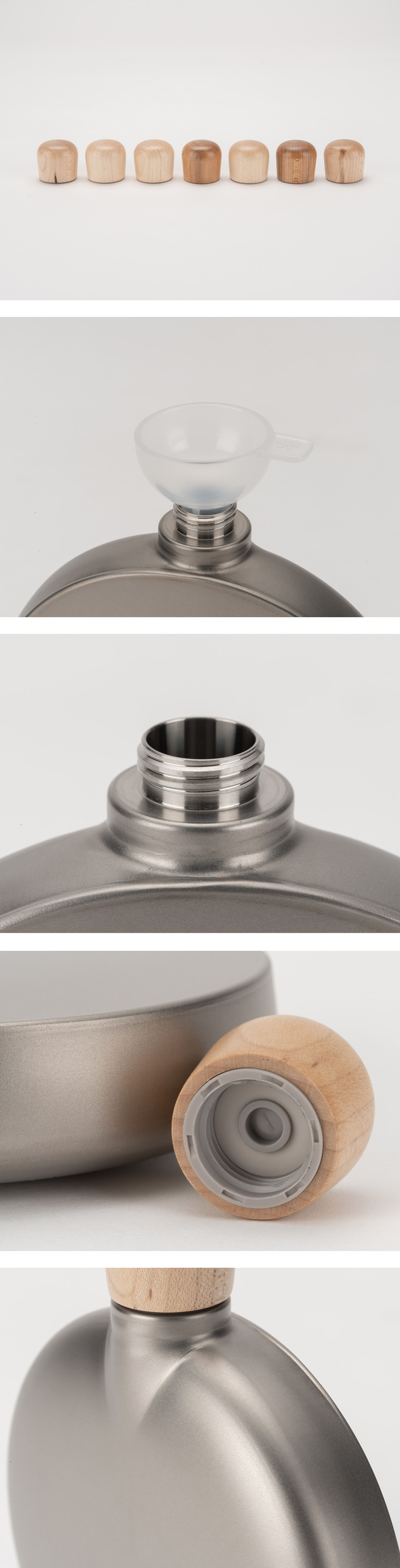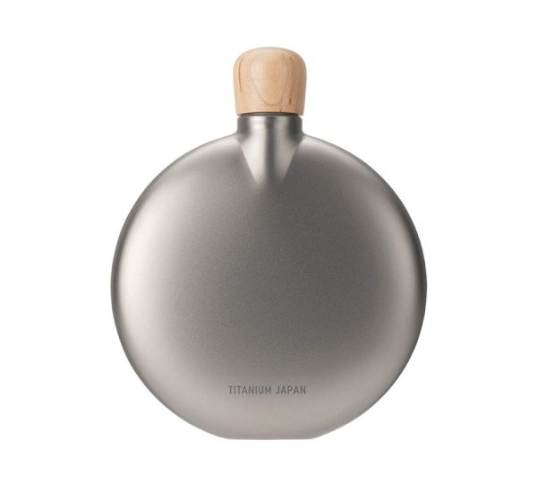 The Round Titanium Flask 150 mL is crafted from lightweight titanium and includes a wooden cap, funnel, and storage case for refined portability. It features an inert material construction that preserves the flavor of spirits, making it suitable for both urban and outdoor celebrations.
