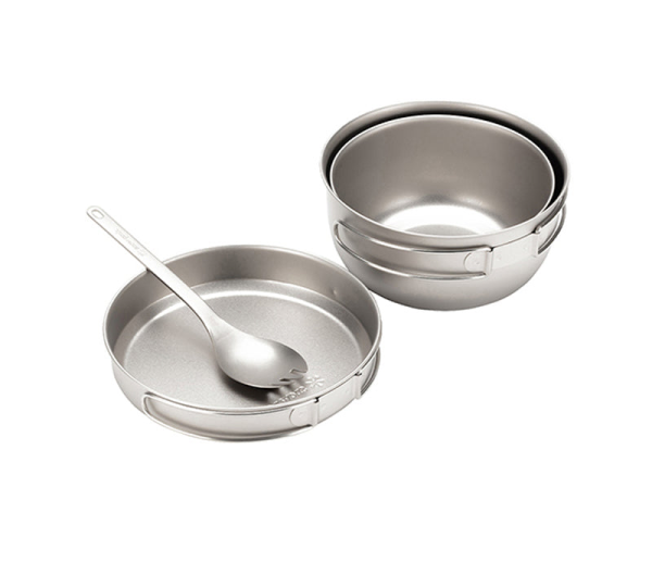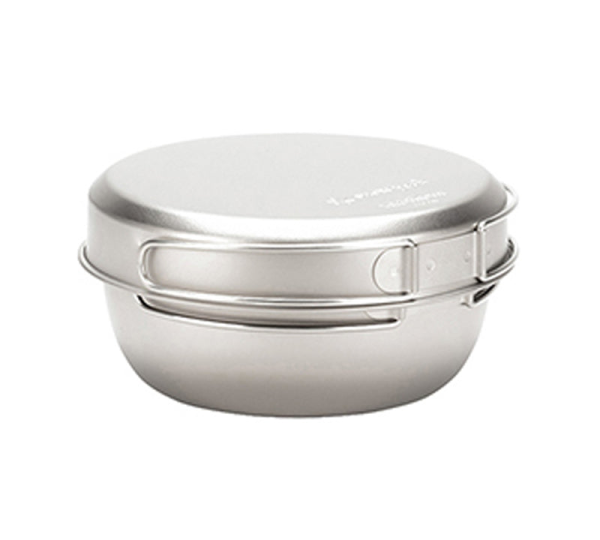 The Titanium 3 Piece Cookset includes two durable pots and a frying pan made from Japanese titanium. Foldable handles and nesting design allow for compact storage, making it suitable for backcountry cooking.