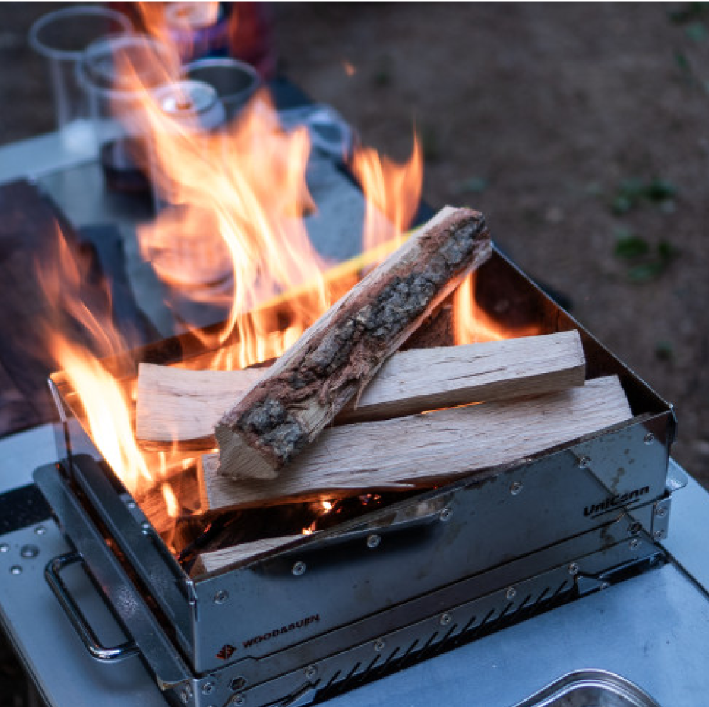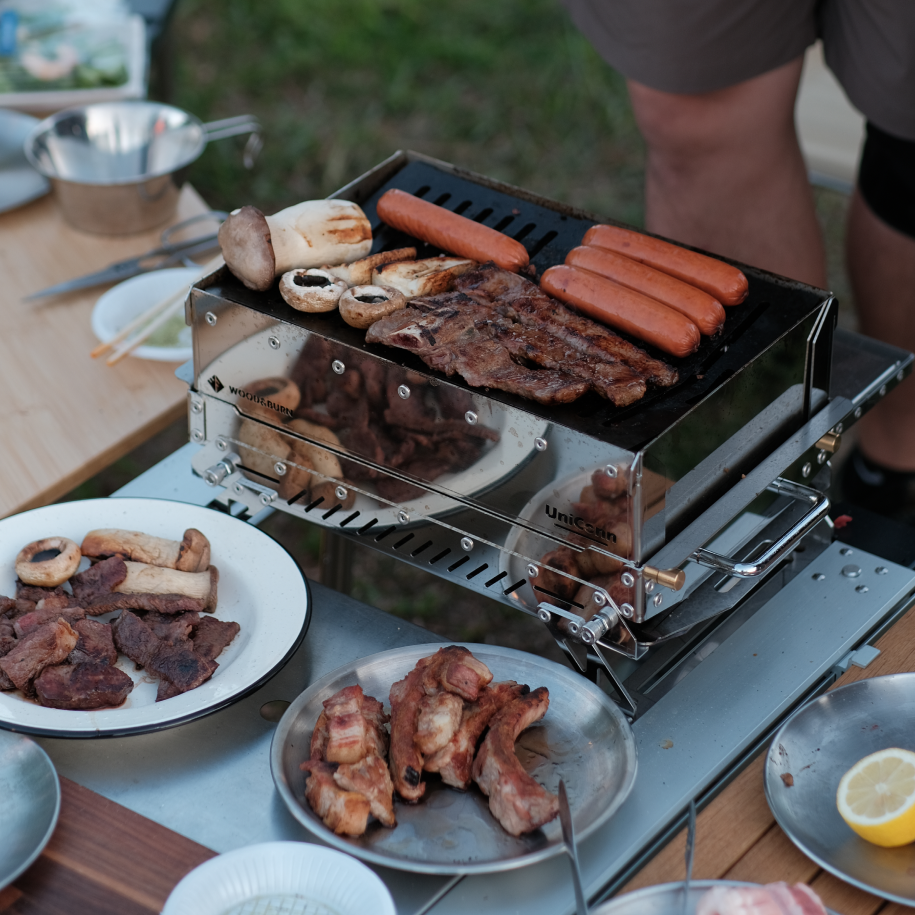 The best part of camping? BBQ🍗 and campfires🔥! With Uniconn M, you can enjoy all of it! Even the smoke grill mode lets you cook dishes that were once challenging to prepare outdoors. Worried about grilling fatty meat over charcoal causing heavy smoke and unexpected flare-ups? Don’t be! Wood & Burn's unique roasting technique prevents oil from dripping onto the charcoal, minimizing smoke and flare-ups. This method is even taking steps to patent this innovation worldwide!