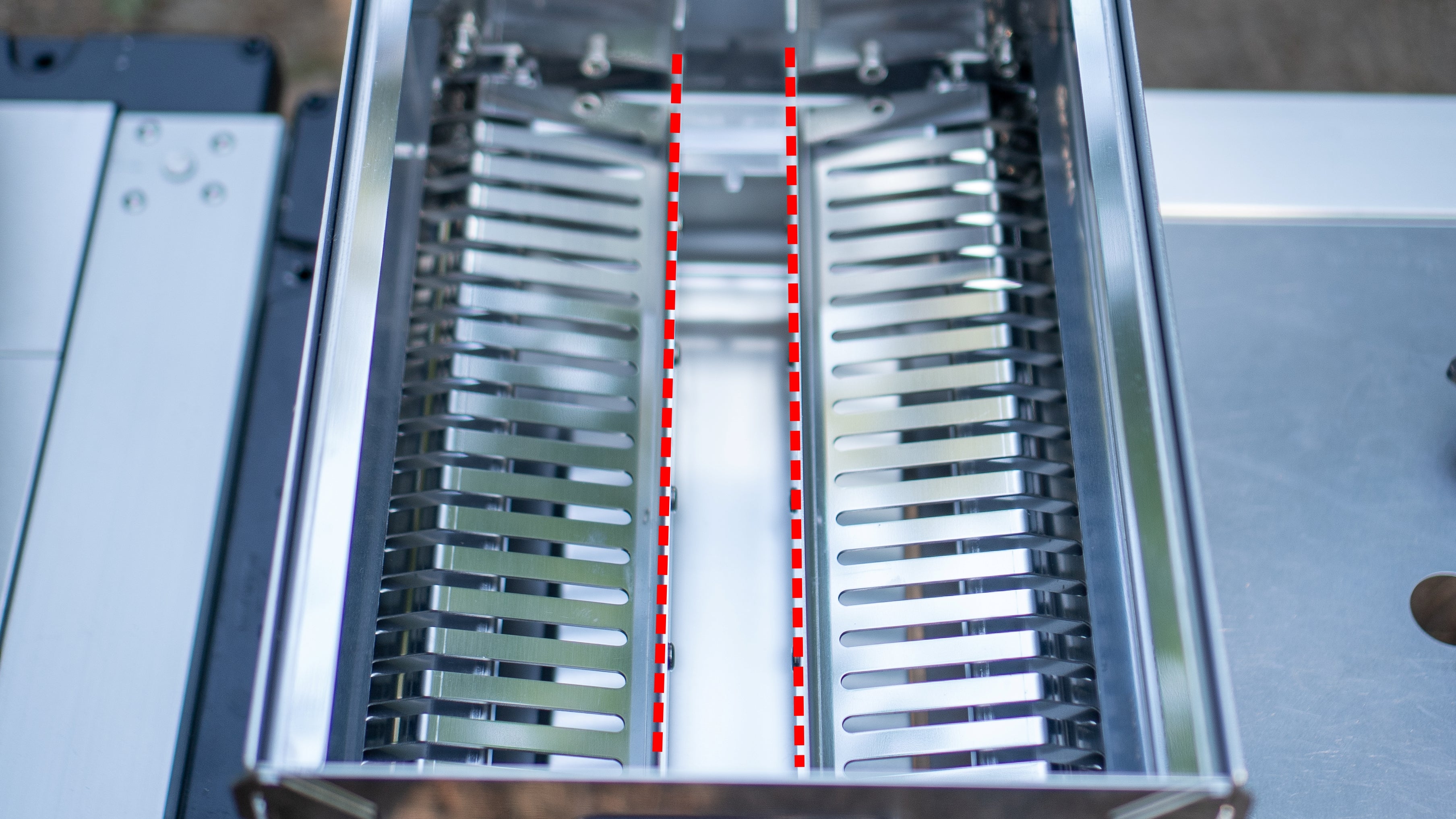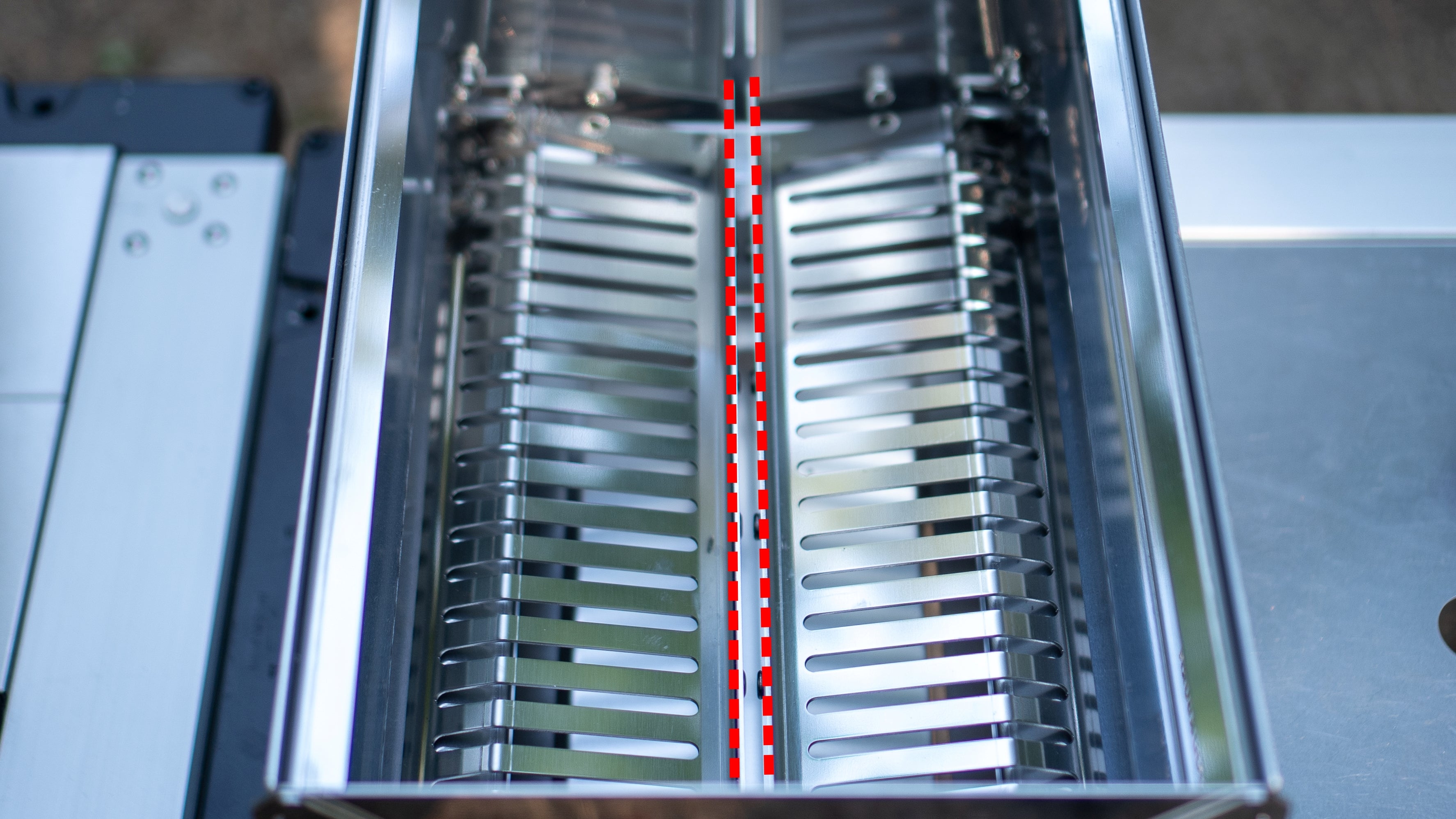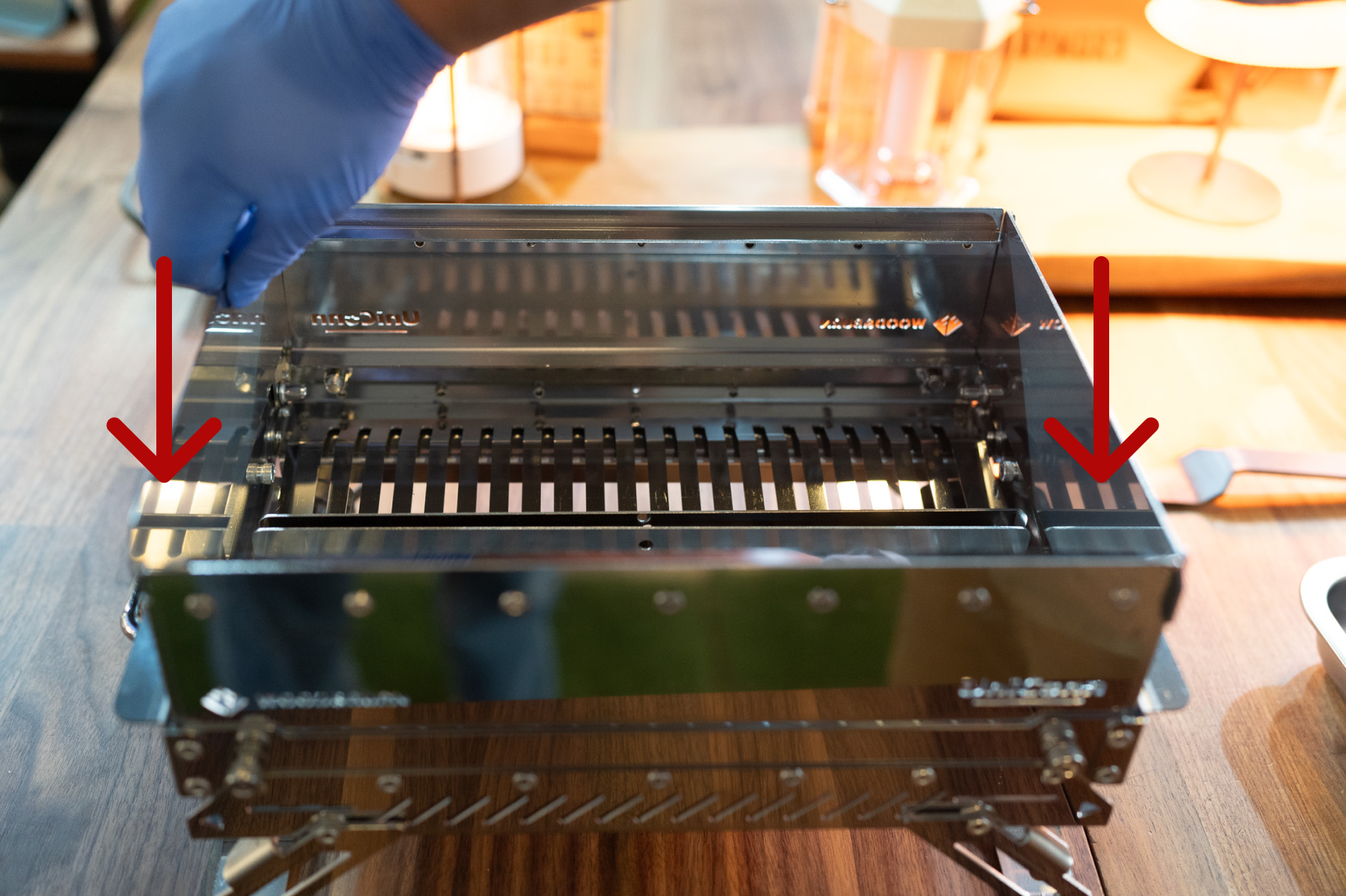 Move the two combustion plates inside the main body towards the side walls, creating a gap in the center. This allows oil to drip through the middle efficiently.