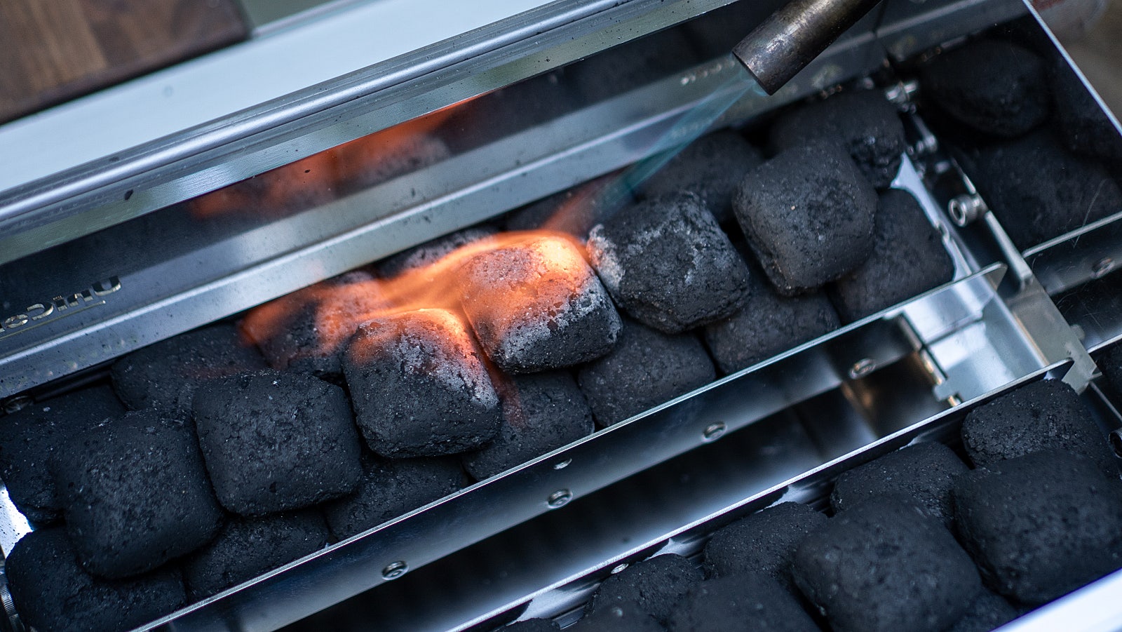 Add the desired amount of charcoal on the open combustion plates on each side and light it.