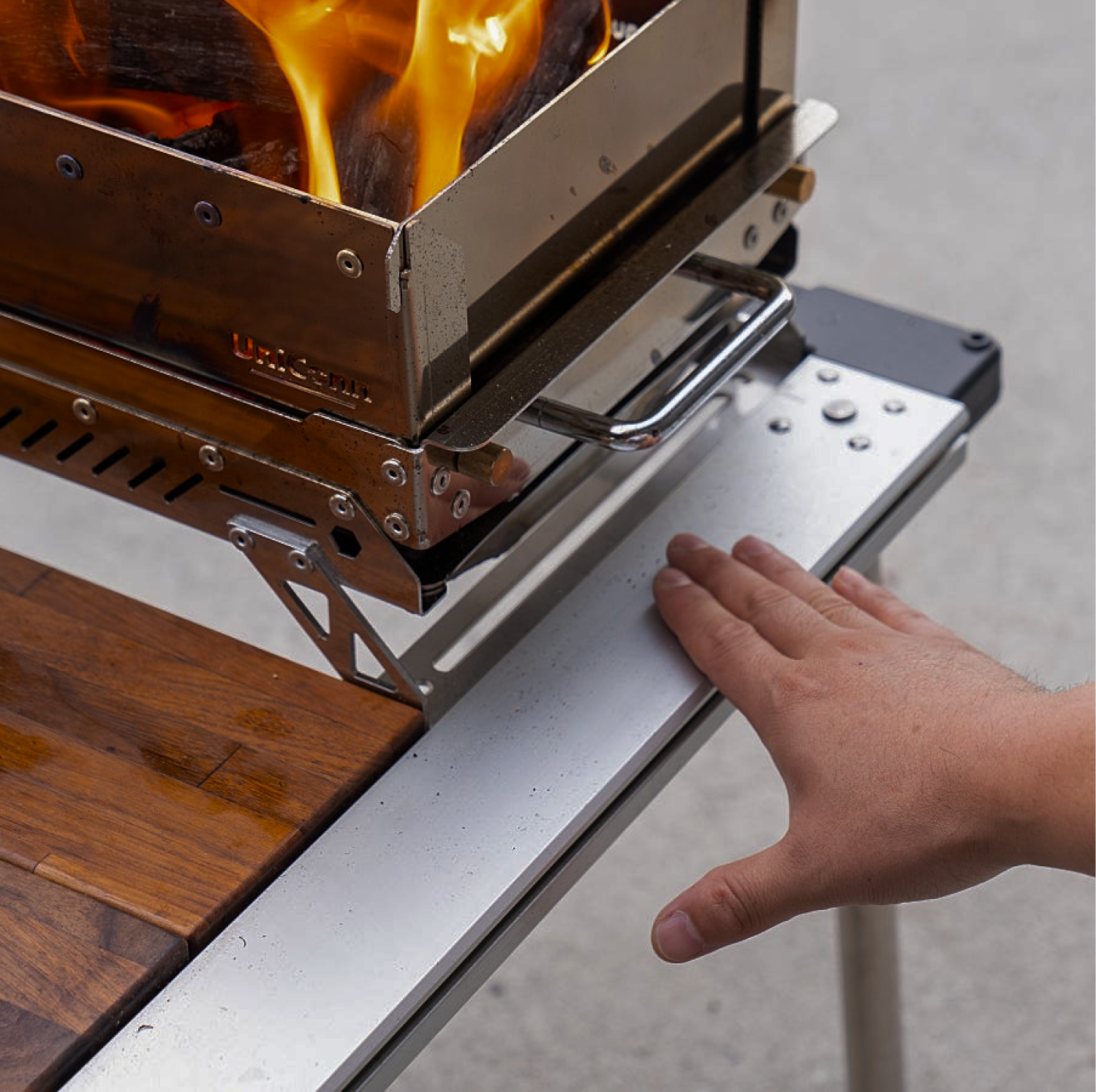 Discover the incredible technology of UnicornM! You can grill on the table without it getting hot! Seriously, check out the photo. We actually lit a fire and placed our hands on the table 😂. Wood&Burn's special heat-blocking technology ensures you can enjoy outdoor activities safely. Plus, with Unnicon M's patented roasting technology, you don't have to worry about smoke or sudden flare-ups while grilling. Isn’t it amazing?