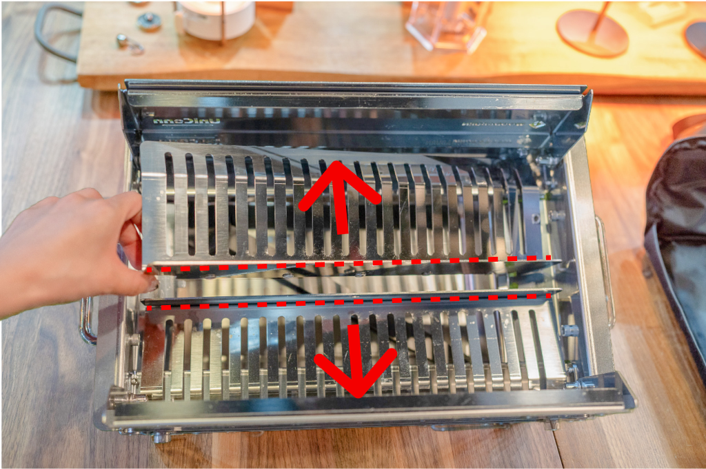 Put the combustion plates into the main body and open it to create a gap in the center