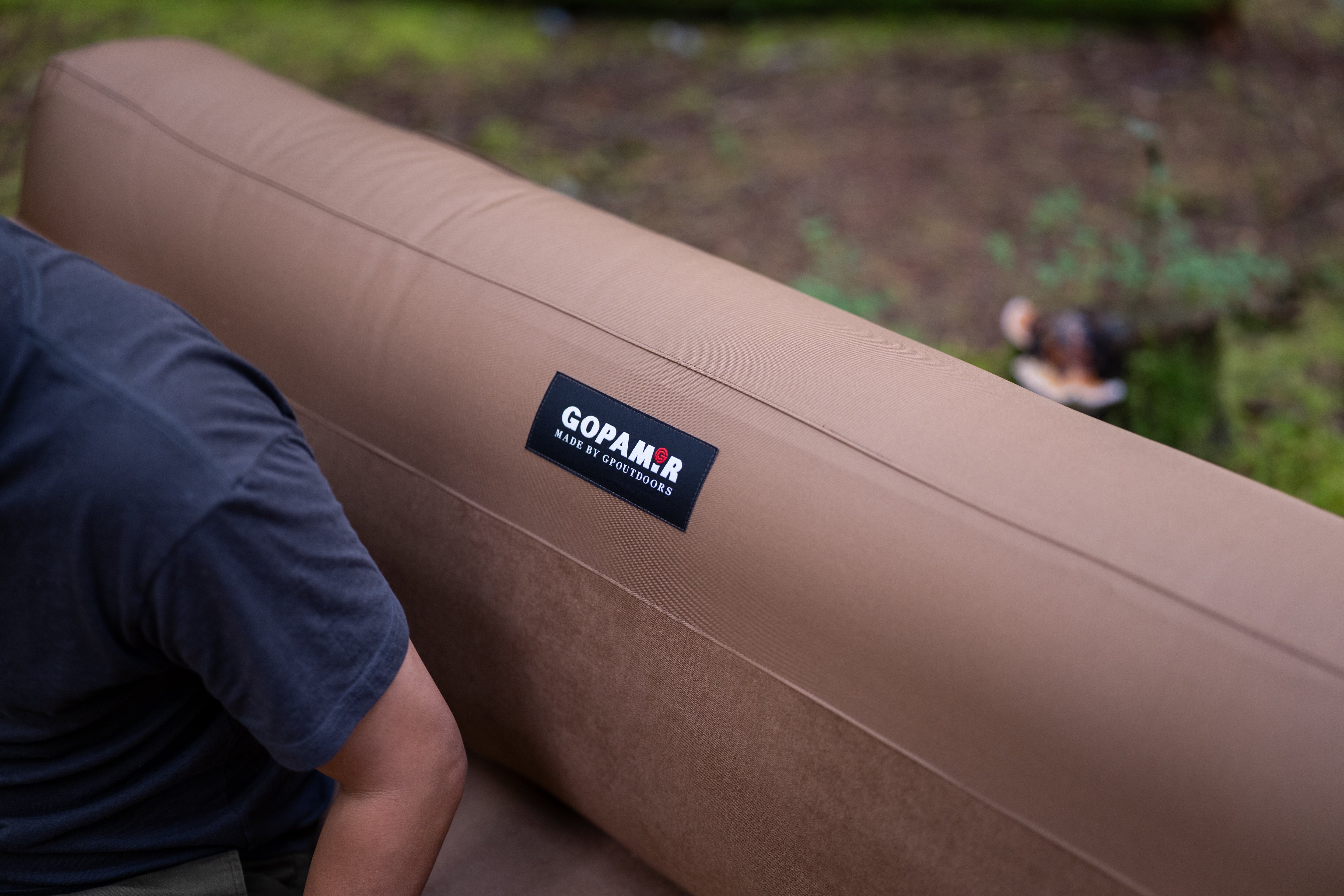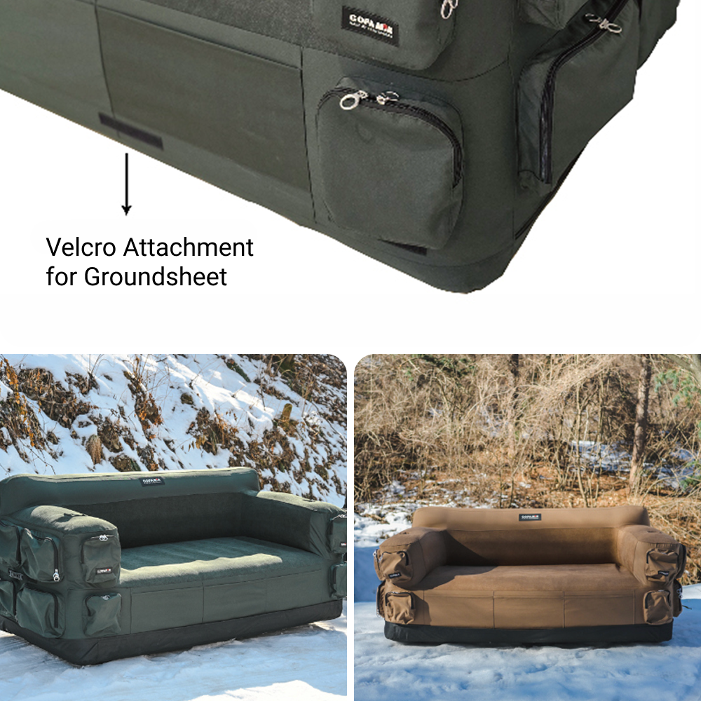 The SF180 Air Sofa includes a ground sheet that securely connects to the sofa base, preventing movement and enhancing stability on uneven terrain.