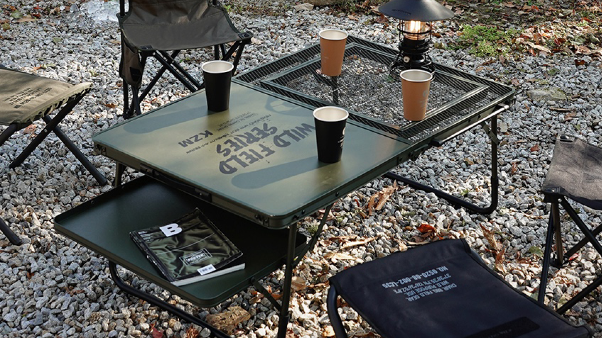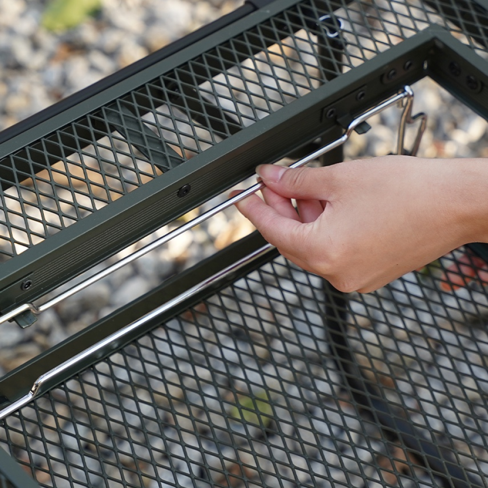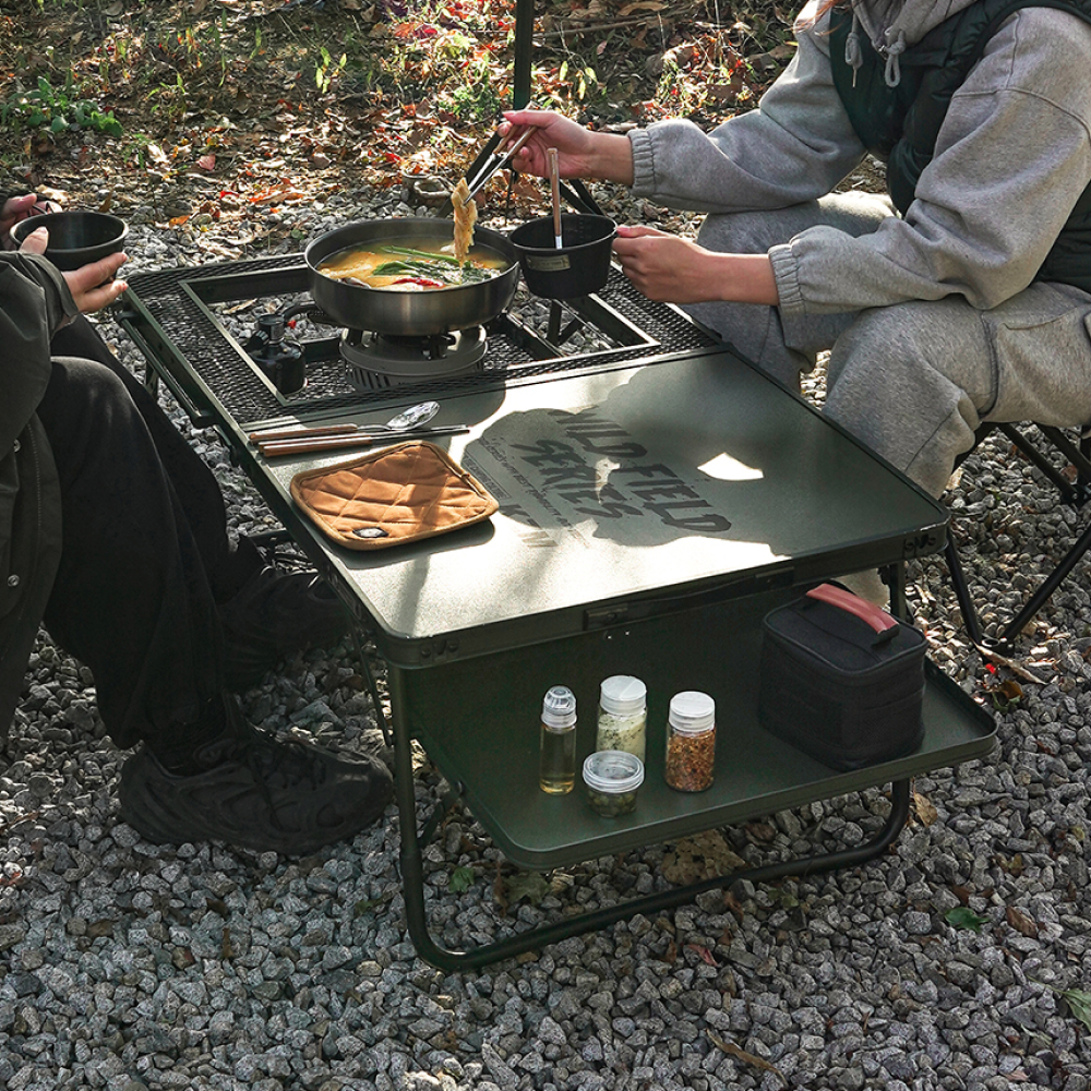The Wild Field 3 Folding BBQ Table is a versatile, foldable camping table with a sturdy steel mesh, adjustable BBQ plate, wide cooking and dining area, and height-adjustable legs for ultimate convenience.