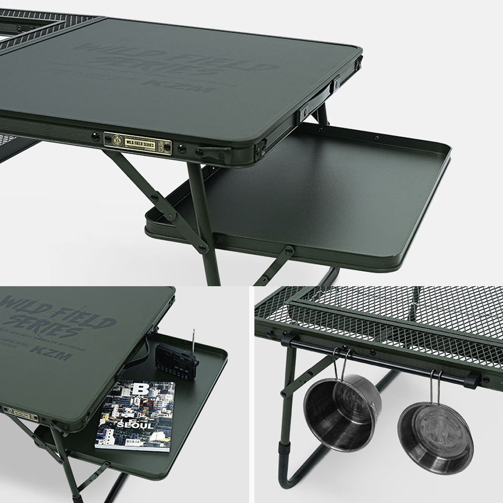 Equipped with a side table that can be used as a simple shelf, it’s convenient for placing small items or condiments. The hanger section allows you to hang sturdy items like a Sierra cup for practical use.