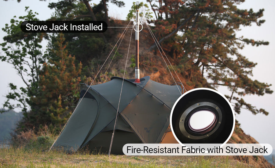 A fire-resistant roof panel protects the shelter fabric from heat exposure, allowing you to stay warm and safe during winter use.