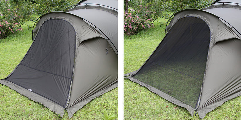 The mesh door easily attaches via zipper for simple setup. It keeps insects out while promoting air circulation, maintaining a clean and breathable space inside.