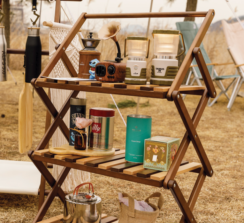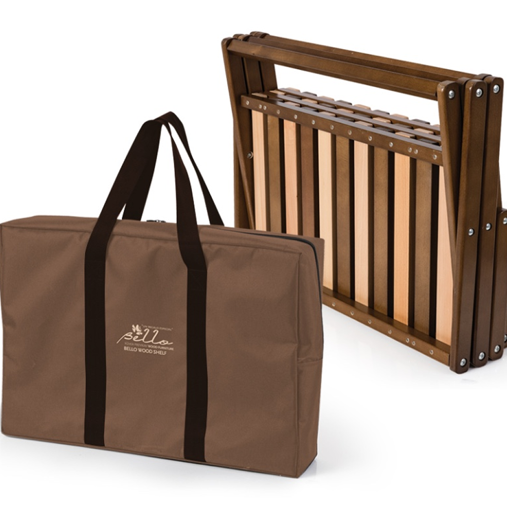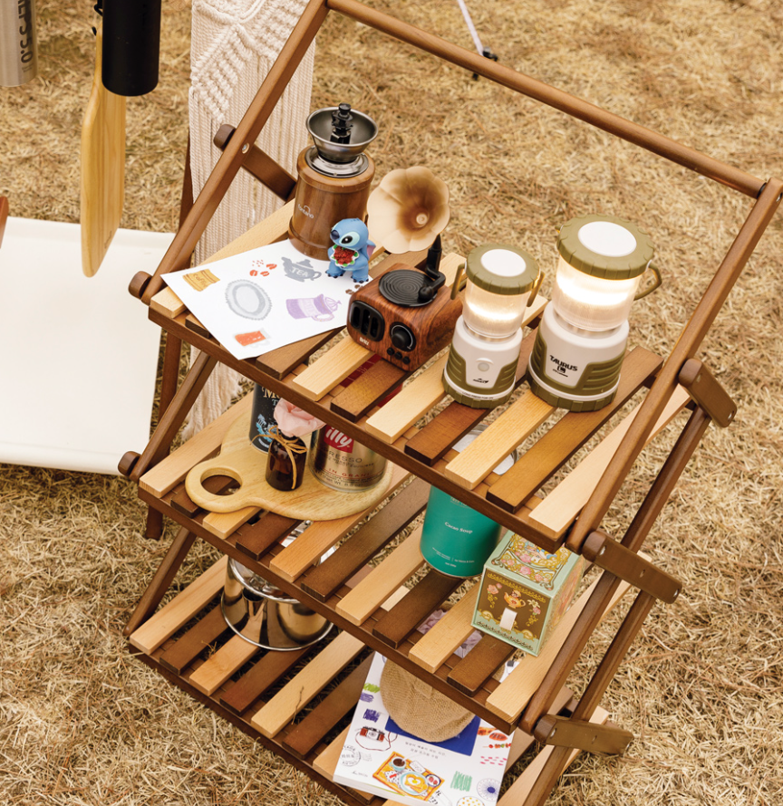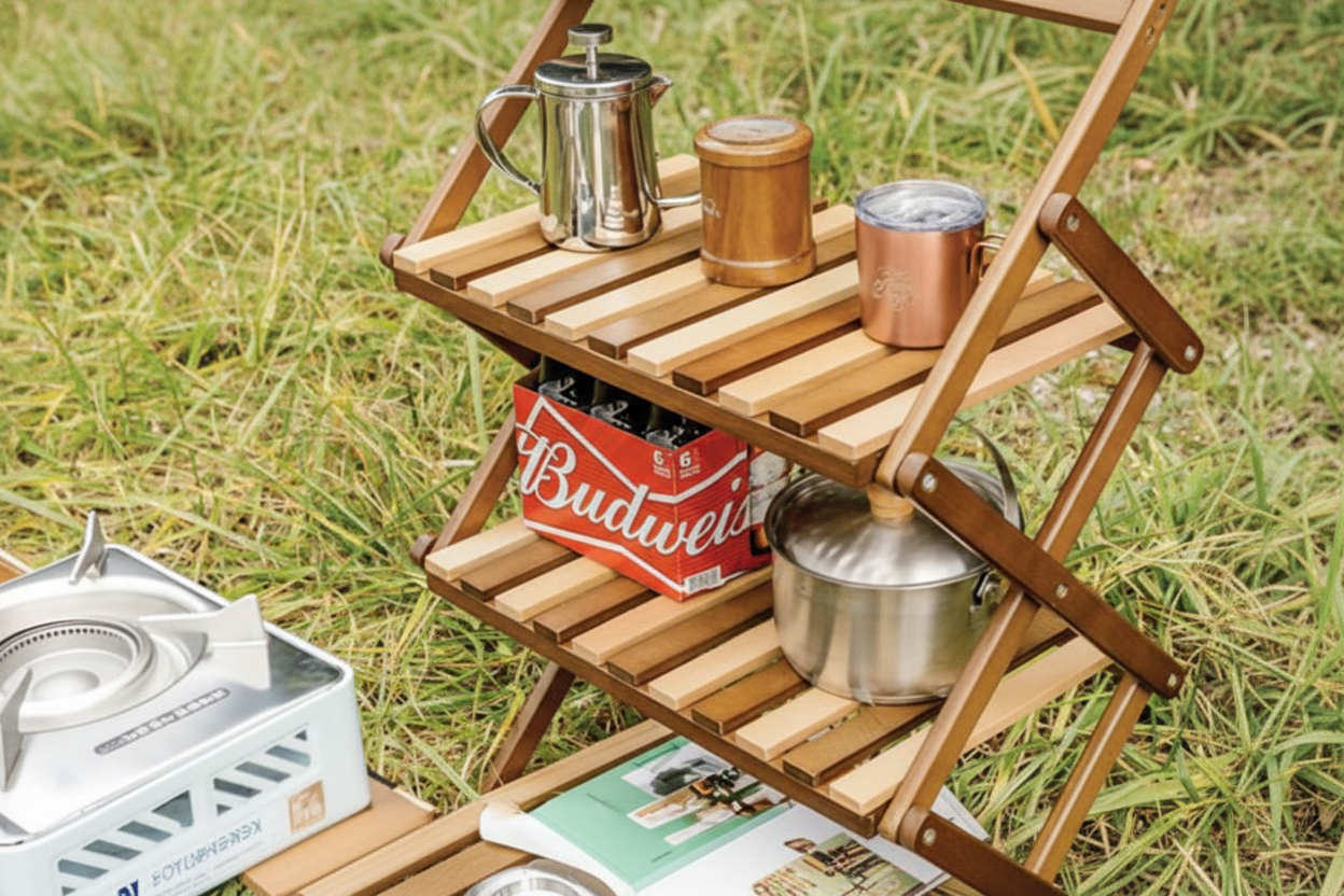 A high-end 32-inch tall camping shelf crafted from durable natural beechwood, featuring an integrated hanging bar and multiple tiers. Supporting up to 66 lbs, its collapsible design ensures a perfect balance between robust storage and convenient portability.