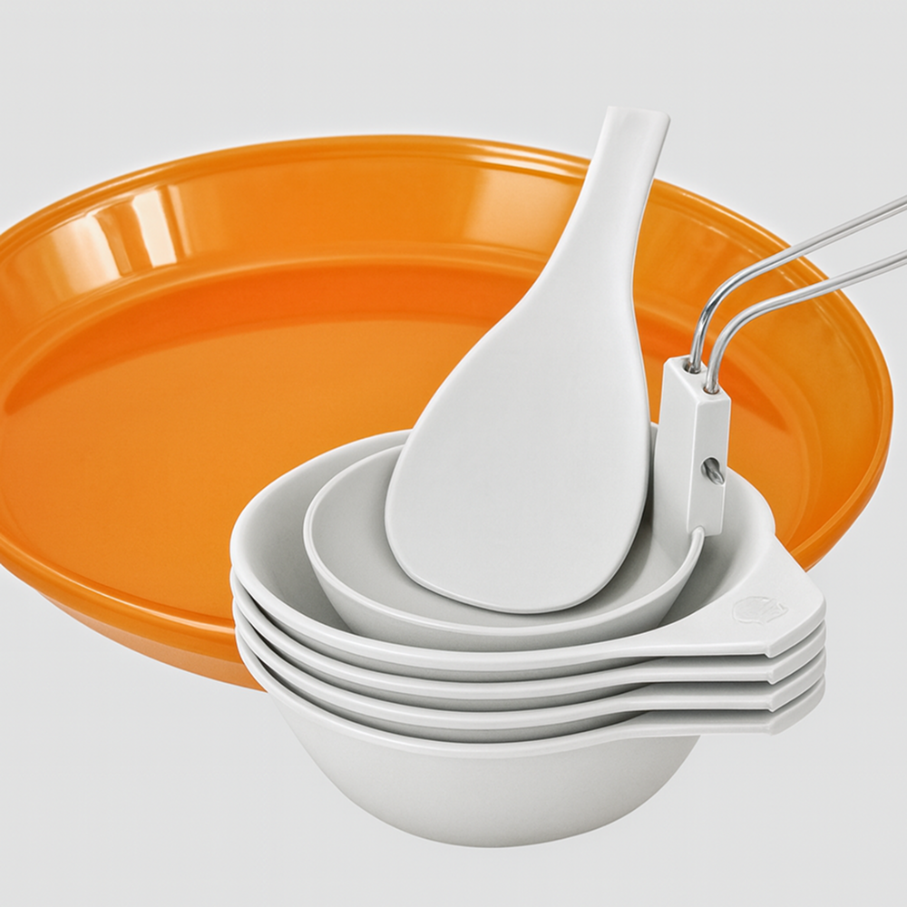 • Plates, Bowls, Rice Paddle, Ladle: Polypropylene (PP)