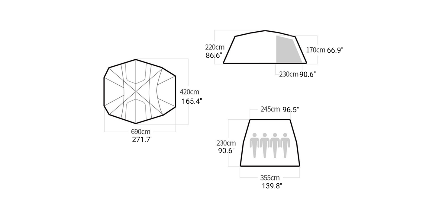 • Inner Tent: 139.8(96.5)"(W) × 90.6"(D) × 66.9"(H)