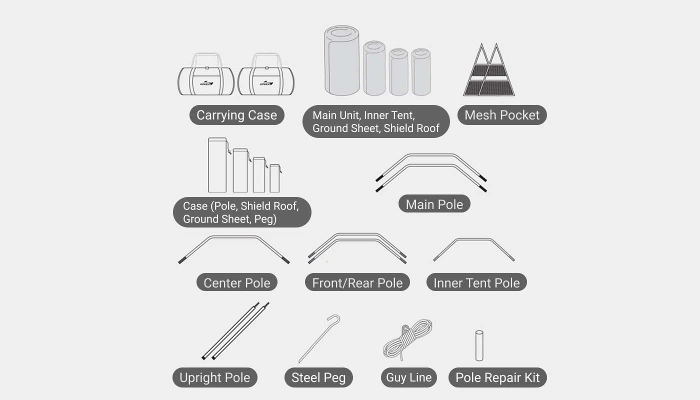Package Includes: Carrying Case * 2 , Main Unit * 1, Inner Tent * 1, Shield Roof * 1, Ground Sheet * 1, Main Pole * 2, Center Pole * 1, Front/Rear Pole * 2, Inner Tent Pole * 1, Upright Pole * 2, Steel Peg * 33, Guy Line * 14, Pole Repair Kit * 1, Cases (Pole, Shield Roof,