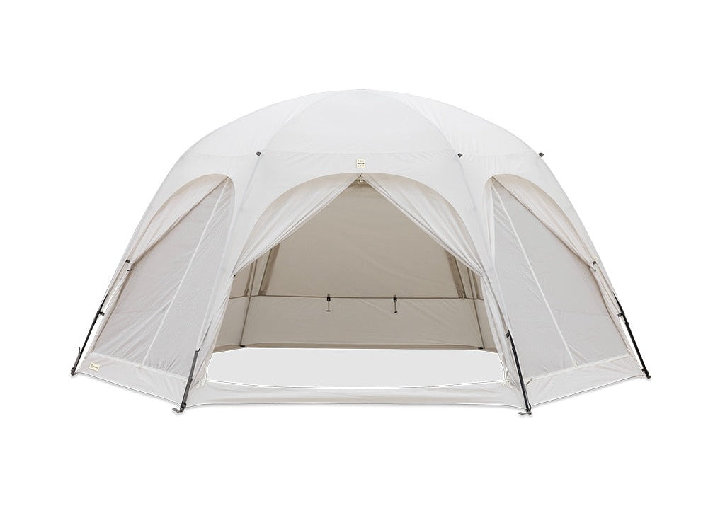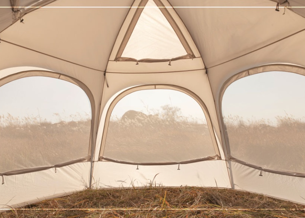 Combines a stable 3-pole hexagonal structure with triangular sky-view ventilation and elegant curtain doors in warm beige for a secure yet poetic atmosphere.
