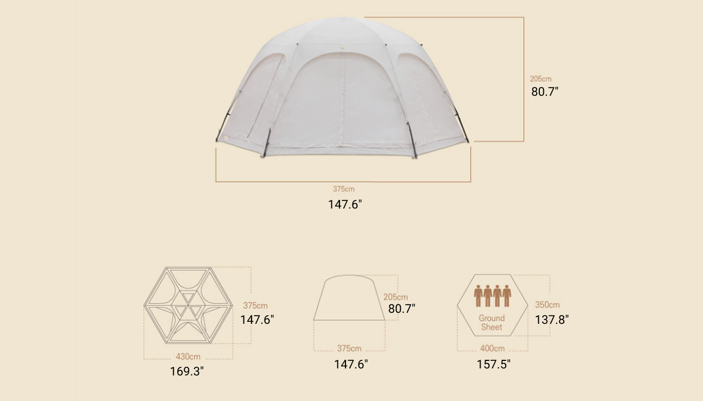 • Ground Sheet: 137.8"(W) × 157.5"(D)