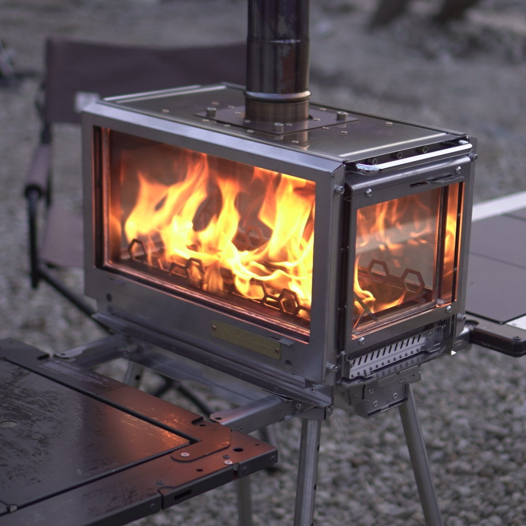 With a simple module swap, the Field Stove can be used as a 4-sided glass fire viewer or as a wood-burning stove (using firewood or pellets). In spring, summer, and fall, the 4-sided glass design allows you to enjoy the flames and cozy warmth from any angle. In winter, switch to pellet burner mode for overnight heating.