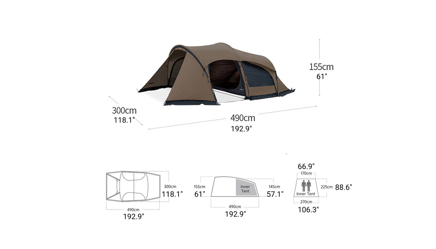 • Inner Tent: 106.3(66.9)"(W) × 88.6"(D) × 57.1"(H)