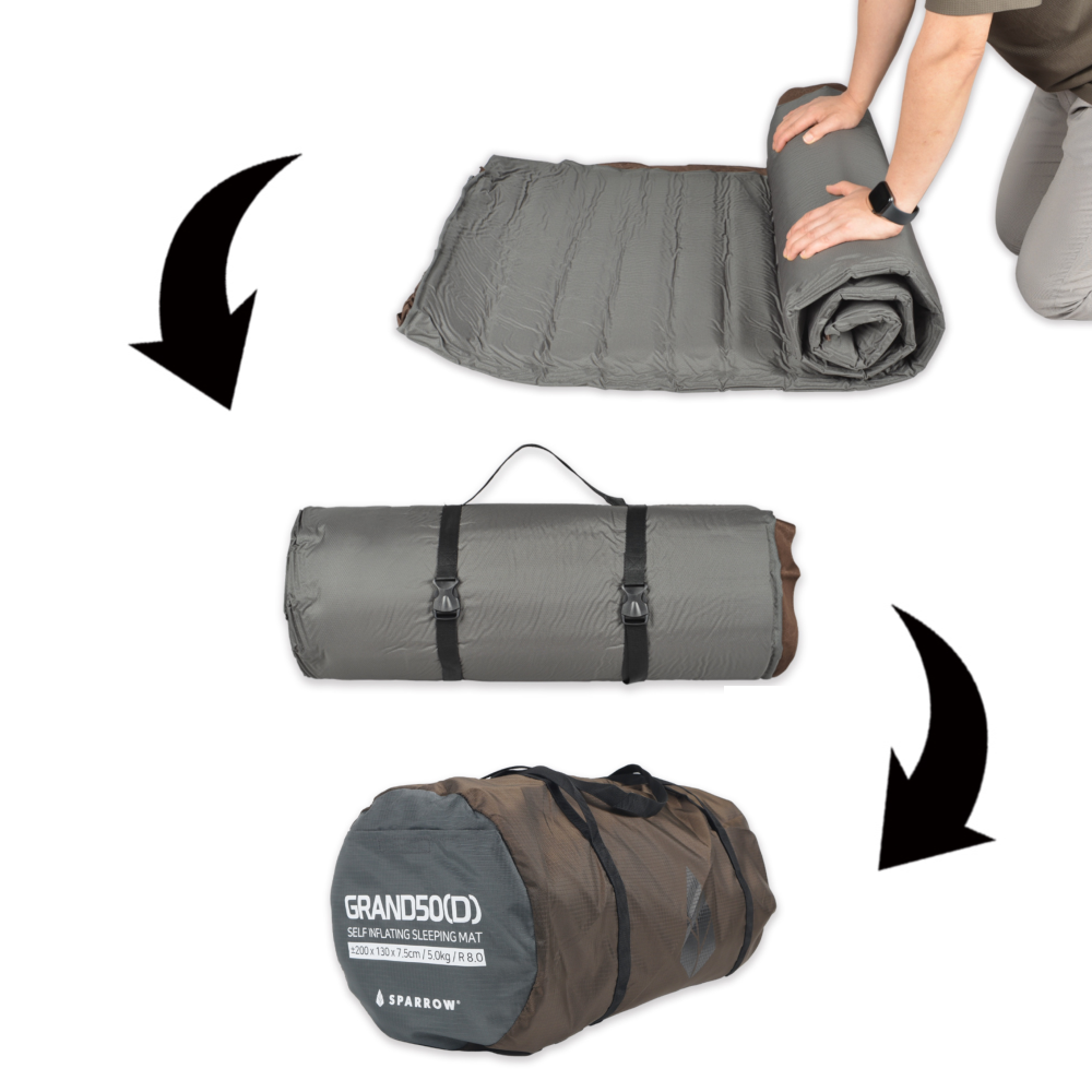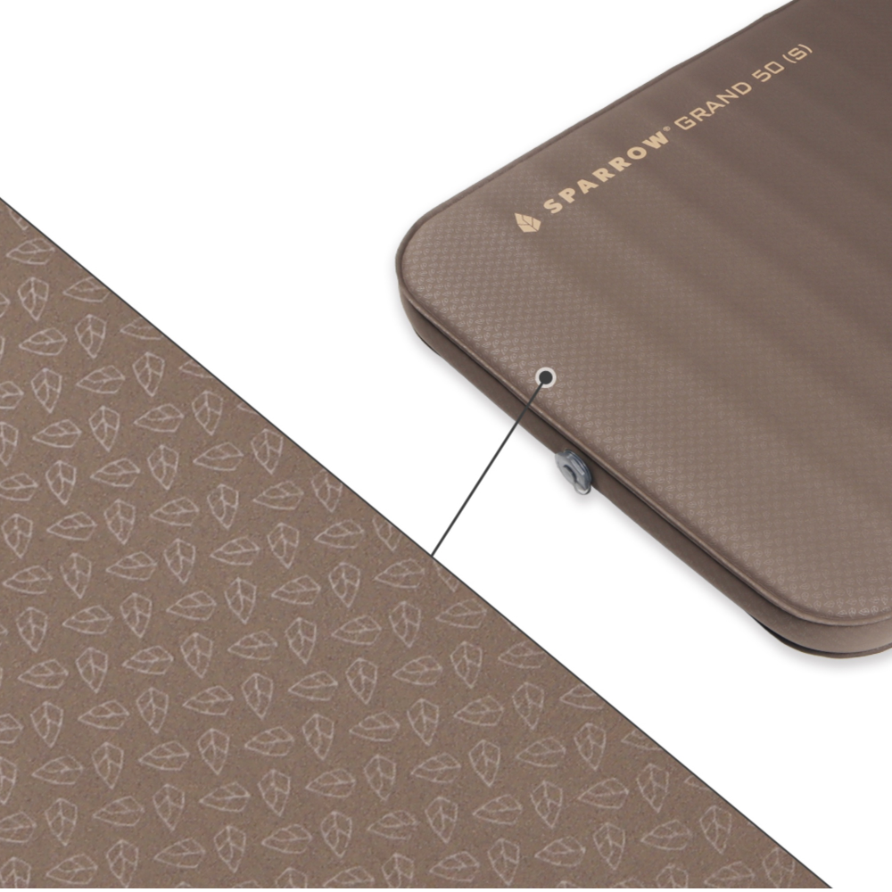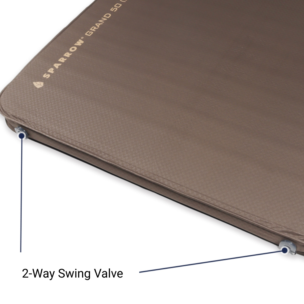 The Grand 50 - Double is a premium double-size outdoor mat with 50D stretch fabric, 2.9"(7.5cm) high-density PU foam, 3D sidewalls, TPU coating, non-slip base, and roll-up storage for ultimate comfort and convenience.