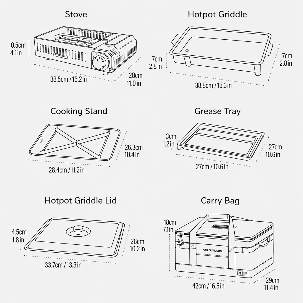 Package Includes: Main Unit(Stove) *1, Hotpot Griddle *1, Cooking Stand *1, Grease Tray *1, Hotpot Griddle Lid *1, Carry Bag*1