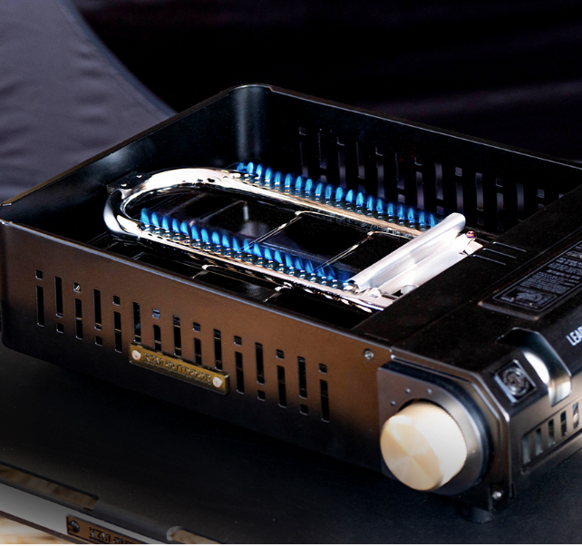 This stove uses a U-shaped burner structure that spreads heat evenly across the cooking surface, helping prevent food from burning on one side or staying undercooked on the other.