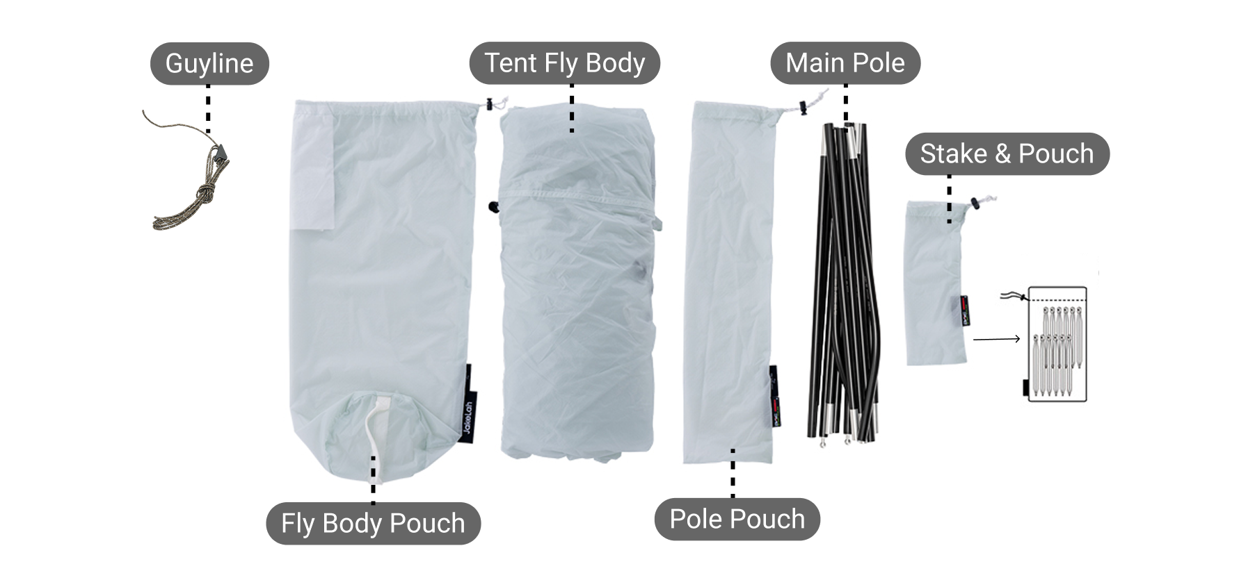 Package Includes: Tent Fly Pouch * 1, Tent Fly Body * 1, Main Pole * 1, Pole Pouch * 1, Stake * 12, Stake Pouch * 1, Guyline 120cm * 4, 170cm * 2 (Included in the body)