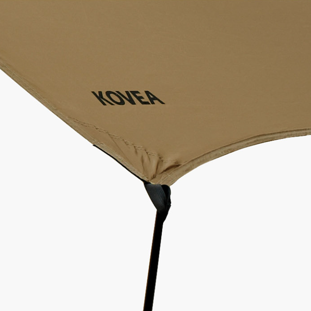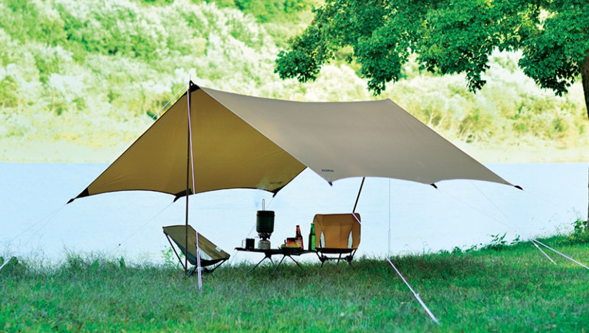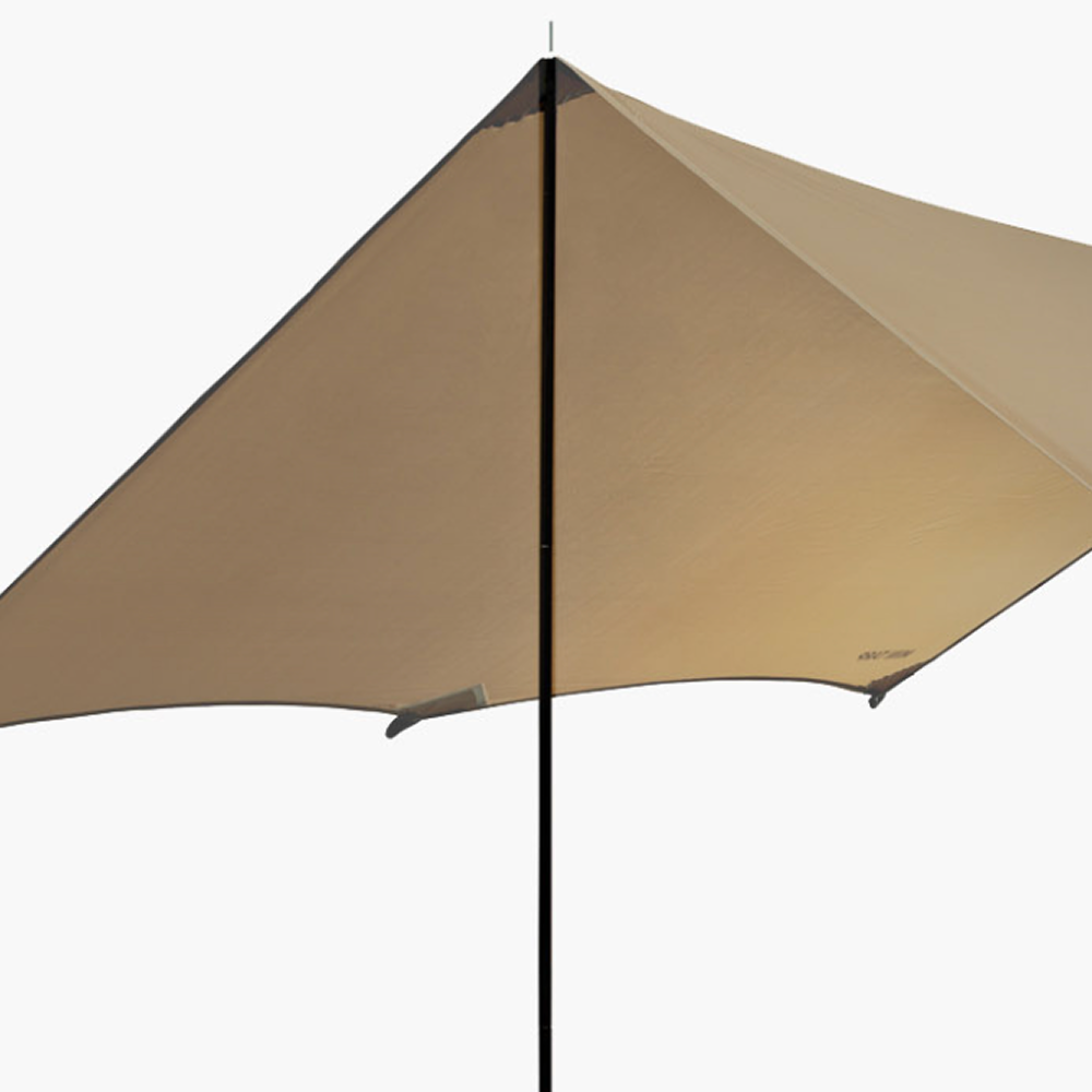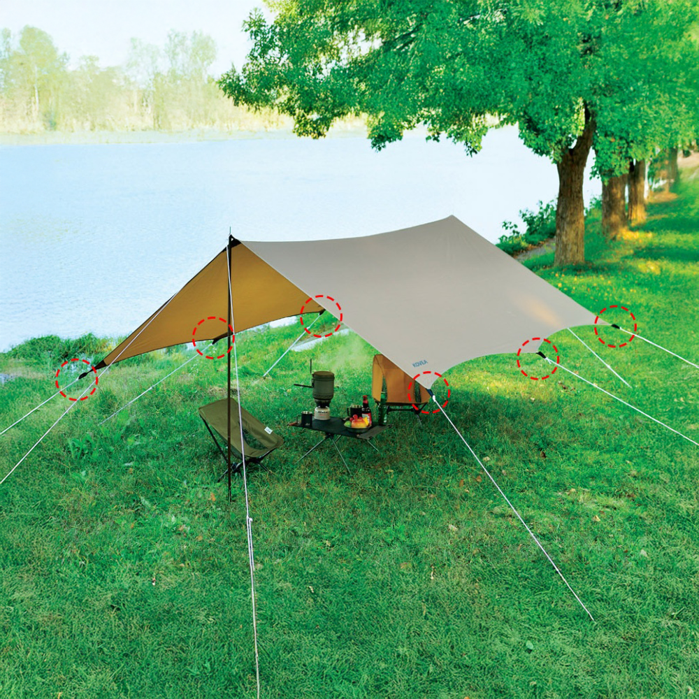 The sides of the tarp can be securely fastened using only guy lines (strings), eliminating the need for separate side poles. This offers high flexibility in adjusting the shape according to the terrain or setup environment.