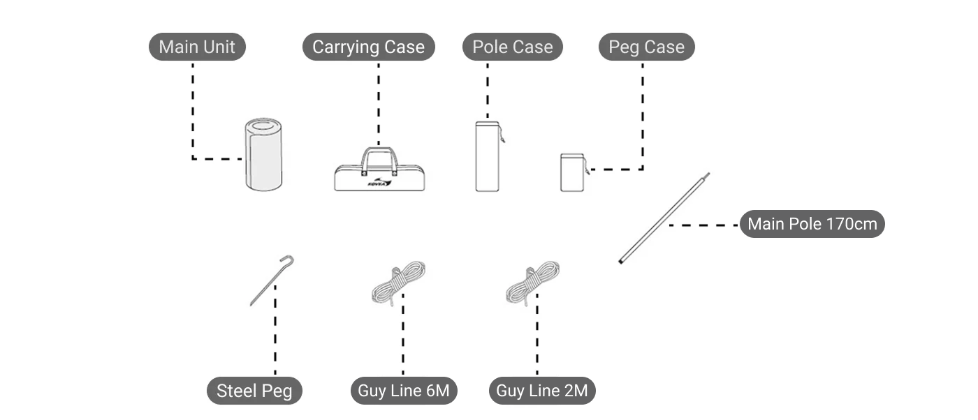 Package Includes: Main Unit * 1, Carrying Case * 1, Pole Case * 1, Peg Case * 1, Main Pole * 2, Steel Peg * 10, Guy Line 6M* 2, Guy Line 2M* 6
