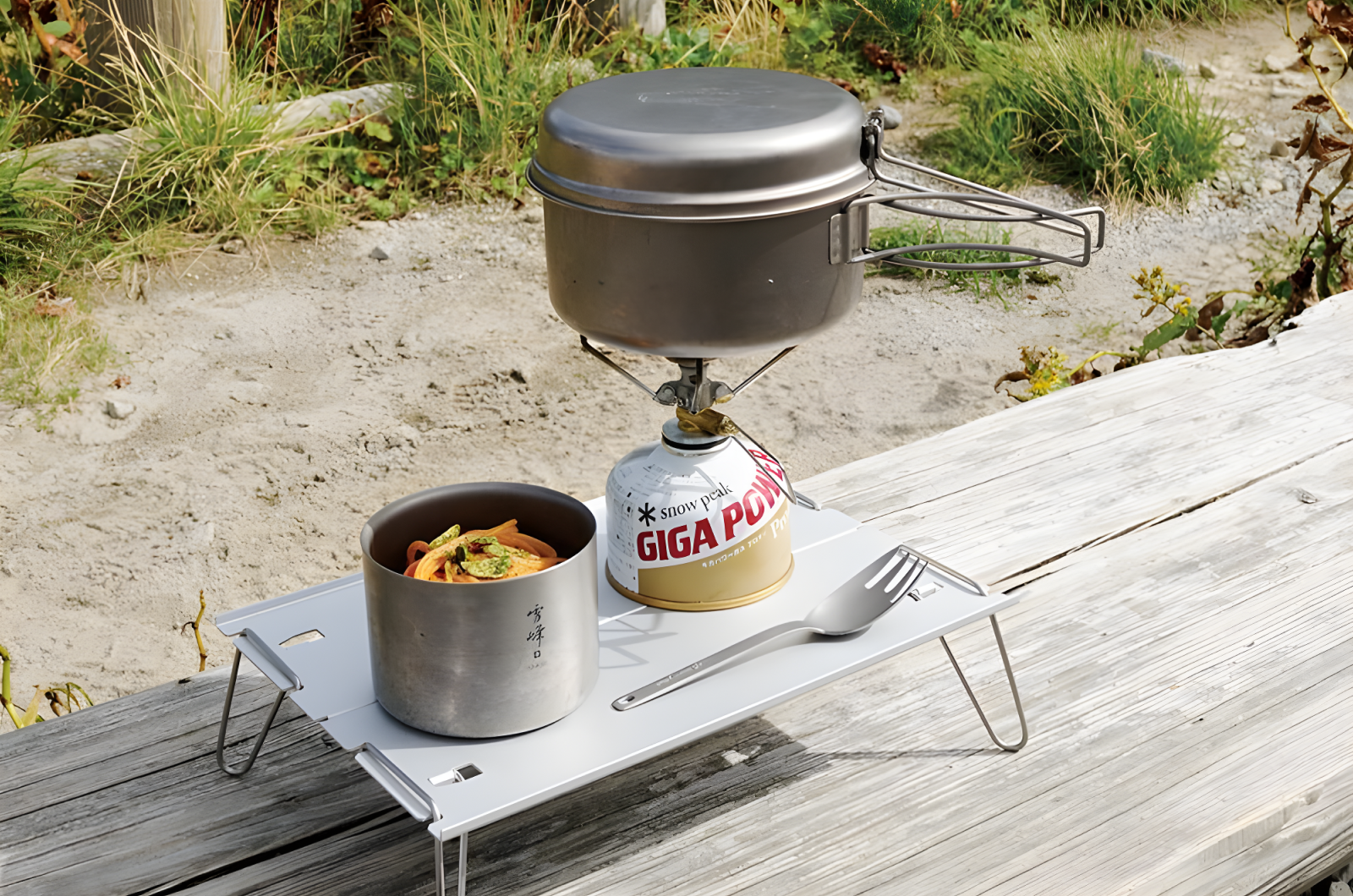 This cookset is crafted from Japanese titanium and designed as a nested, space-efficient system of pots and pans tailored for outdoor use. The folding handles and stacking capability help minimise bulk while maintaining quality cooking functionality.