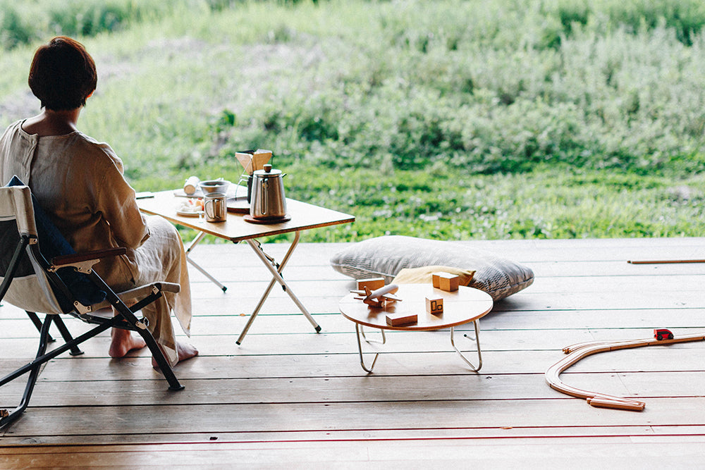 Designed in Japan, the Renewed Single Action Table Low Medium features a laminated bamboo top in an updated finish and stable aluminum legs.
