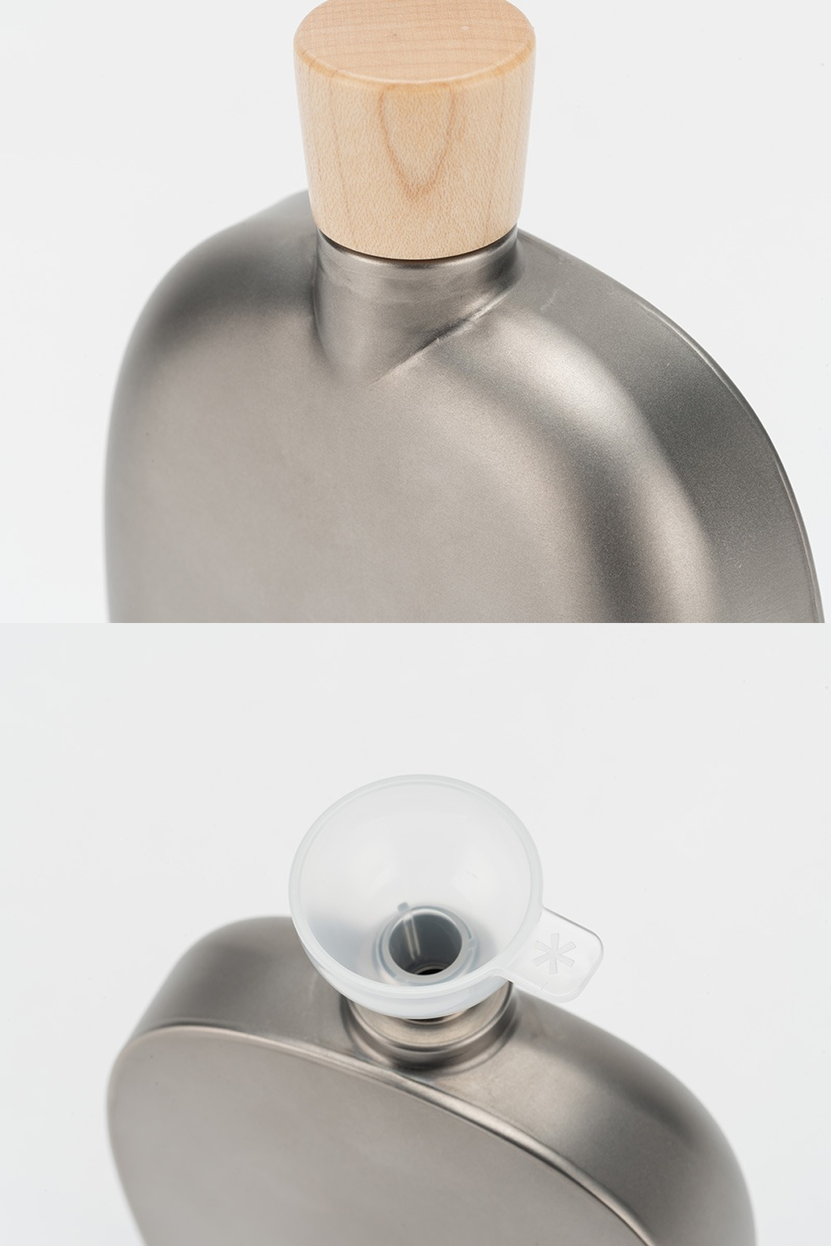 The Titanium Flask has been renewed with a unisex design suitable for everyday use. Its gender-neutral appearance allows it to fit seamlessly into daily life. The wooden cap provides a soft, natural feel while reducing friction when screwing it on. The back of the flask is rounded, and the front edge is refined using the latest welding techniques.